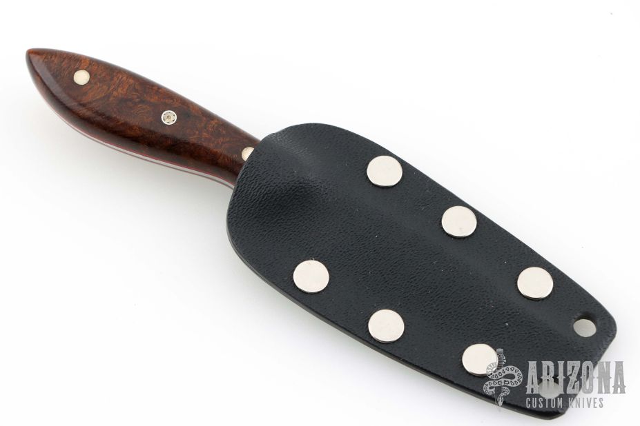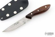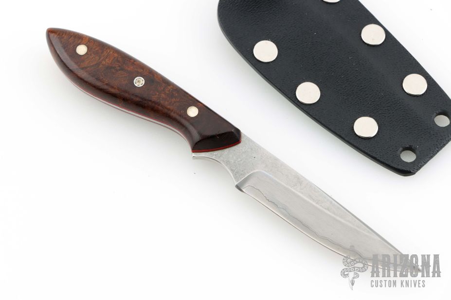 This Pipsqueak by Murray Carter features a Damascus blade with .078" blade stock and .554" blade depth, full tapered tang construction. The handle has desert ironwood scales with red liners, nickel silver and mosaic pins. Comes with a Kydex sheath. Excellent condition.