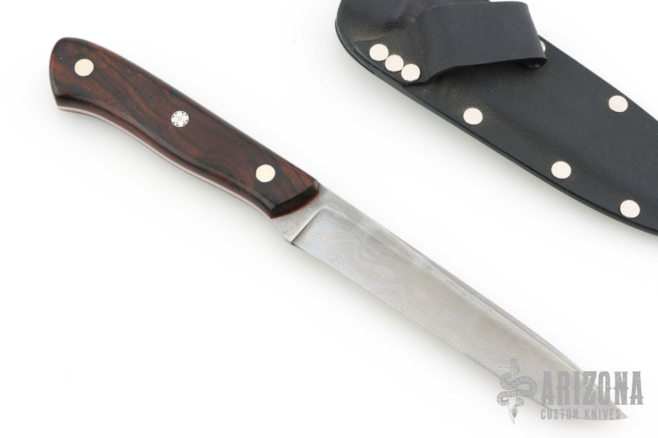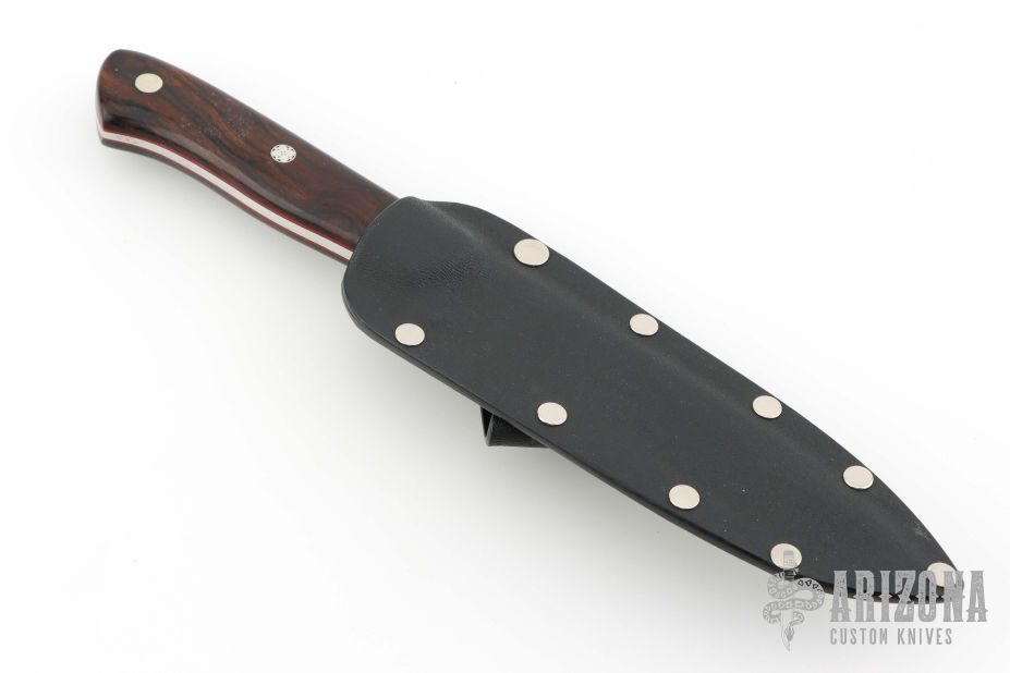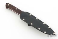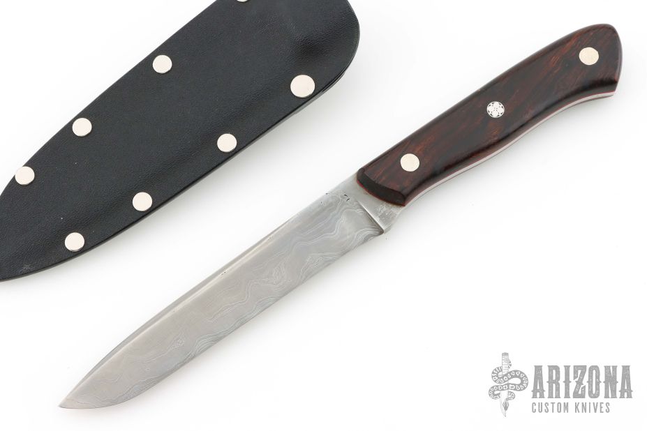 This knife by Master Smith Murray Carter features a Ladder Damascus blade with a false top edge, .169" blade thickness and .976" blade depth, full tang construction. The handle has Ironwood scales with red liners, nickel silver and mosaic pins. Comes with kydex sheath. This knife has been reground by Murray Carter and the stamp has been pretty much ground off, you can only see the last little bit of it, has some light scratches, otherwise good condition.