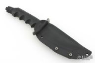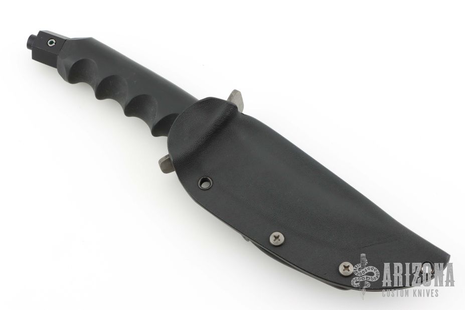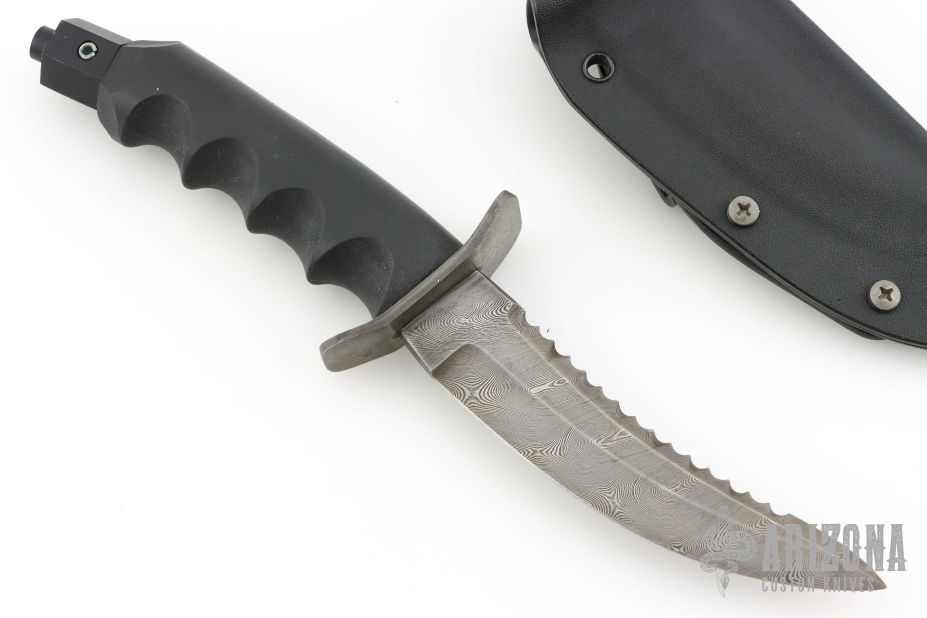 This Hobbit Warrior by REKAT features a Damascus blade with .153" blade stock. 1.160" blade depth. Serrated top edge. Damascus guard. Rubber handle. Black coated butt cap. Comes with kydex sheath with belt loop. Has a couple light scuffs, otherwise excellent condition. #4 of 10