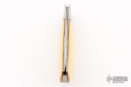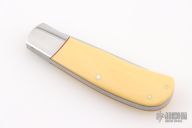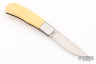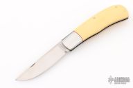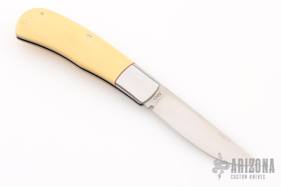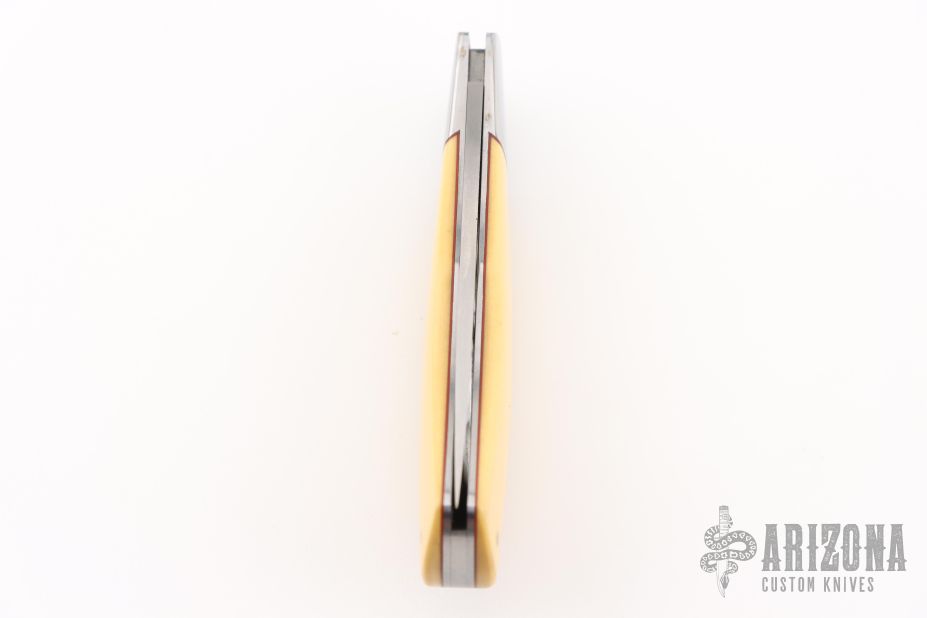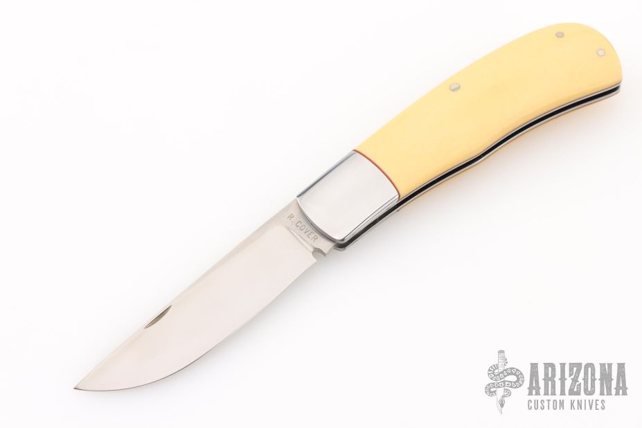 This slipjoint by Ray Cover features a hand rub satin finished blade with a nail nick. The handle has dovetailed and polished stainless steel bolsters, Westinghouse paper micarta covers with red liners, stainless steel liners and spring. Has half-stop, flush in the open and closed positions. Excellent condition. Comes with a zippered case.