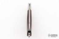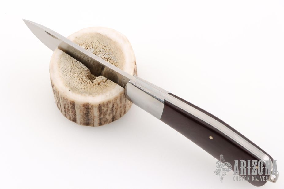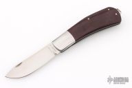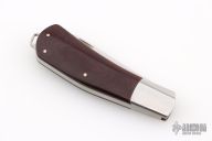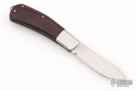 This slipjoint by Ray Cover features a hand rub satin finished blade with a nail nick. The handle has dovetailed and polished stainless steel bolsters, maroon linen micarta covers with black liners, stainless steel liners and spring. Has half-stop, flush in the open and closed positions. Excellent condition. Comes with a zippered case.