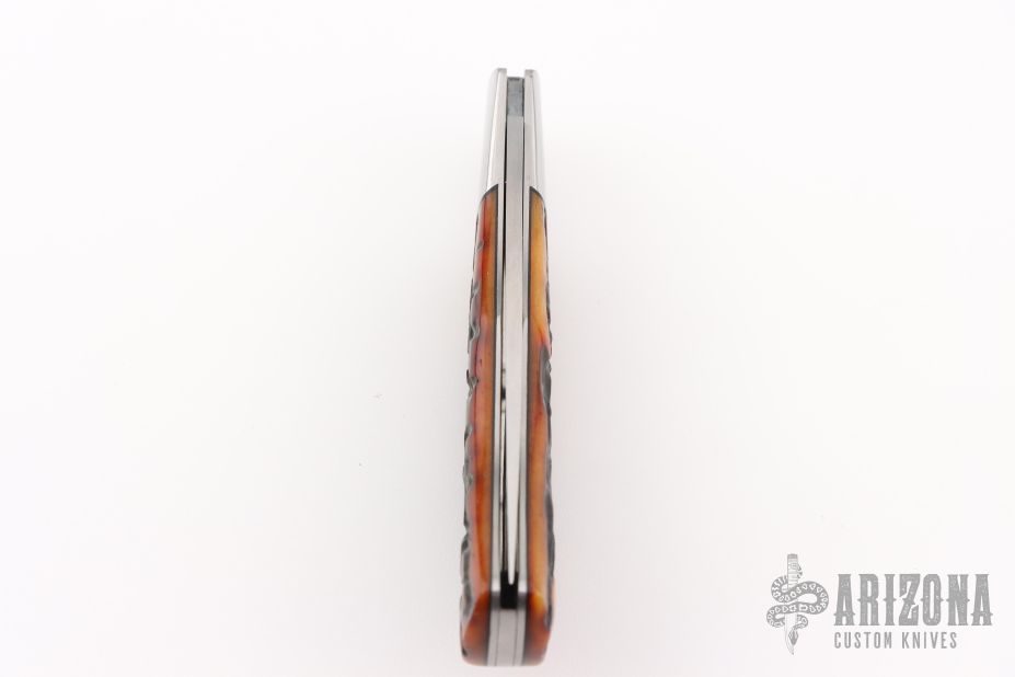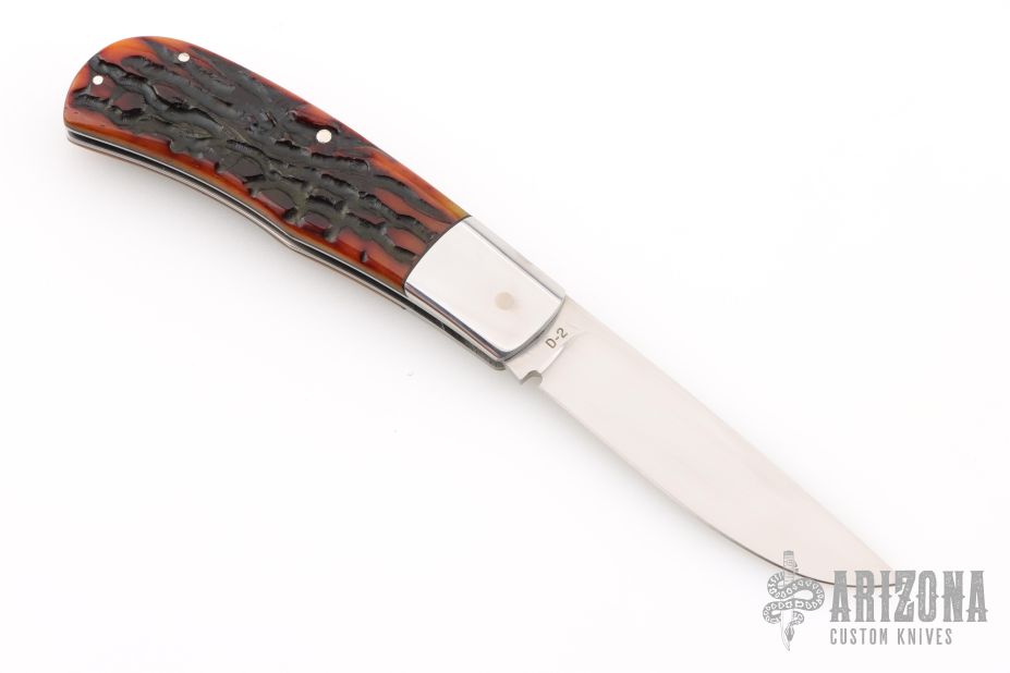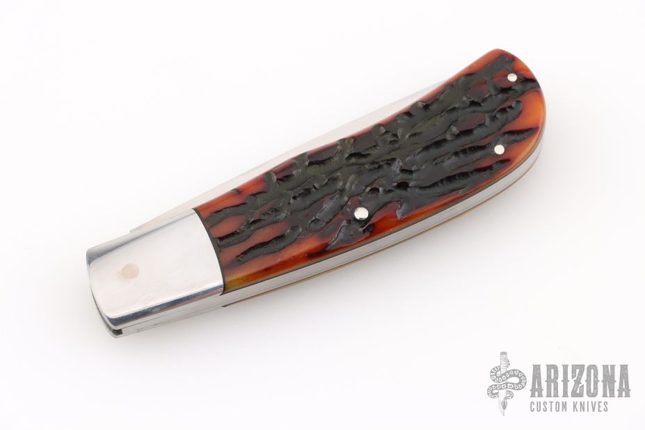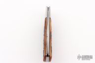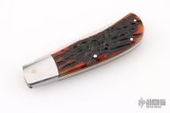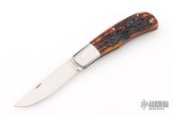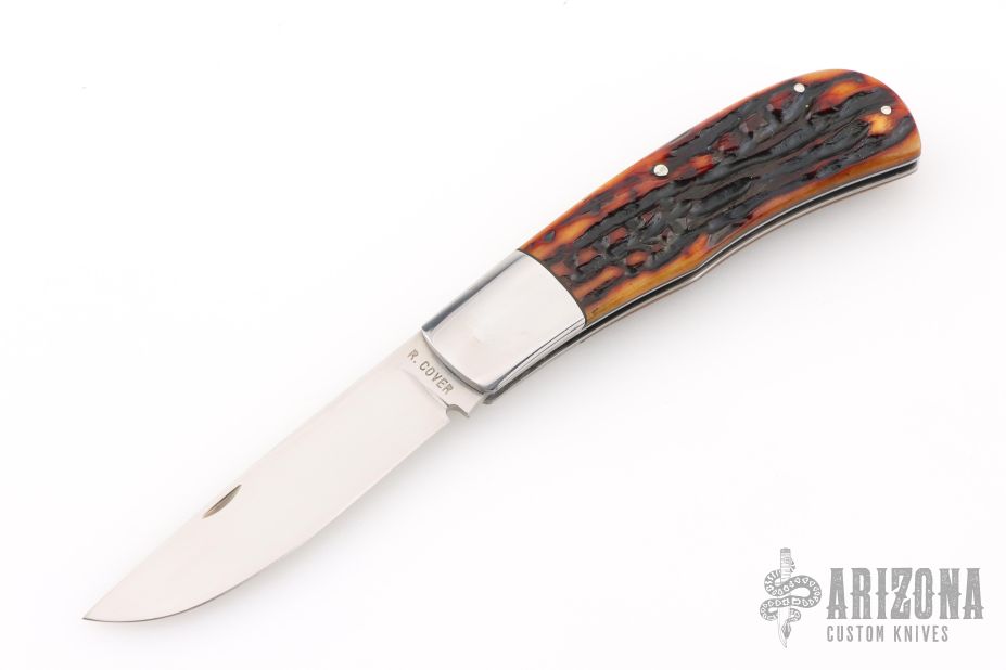 This slipjoint by Ray Cover features a hand rub satin finished blade with a nail nick. The handle has dovetailed and polished stainless steel bolsters, jigged bone covers with black liners, stainless steel liners and spring. Has half-stop, flush in the open and closed positions. Excellent condition. Comes with a zippered case.