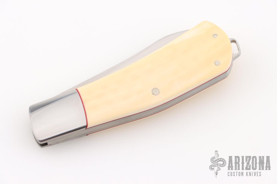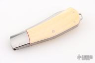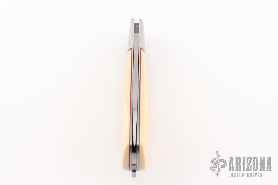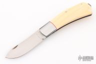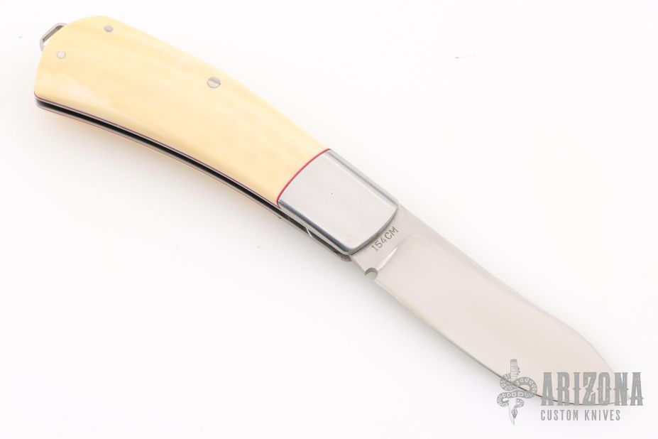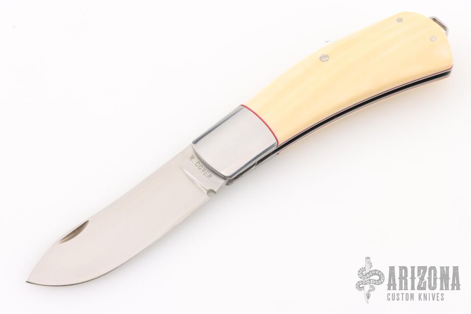 This slipjoint by Ray Cover features a hand rub satin finished blade with a nail nick. The handle has dovetailed and polished stainless steel bolsters, mammoth ivory covers with red liners, stainless steel liners and spring. Has half-stop, flush in the open and closed positions. Excellent condition. Comes with a zippered case.