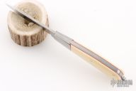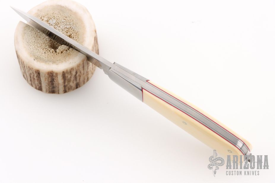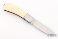 This slipjoint by Ray Cover features a hand rub satin finished blade with a nail nick. The handle has dovetailed and polished stainless steel bolsters, mammoth ivory covers with red liners, stainless steel liners and spring. Has half-stop, flush in the open and closed positions. Excellent condition. Comes with a zippered case.