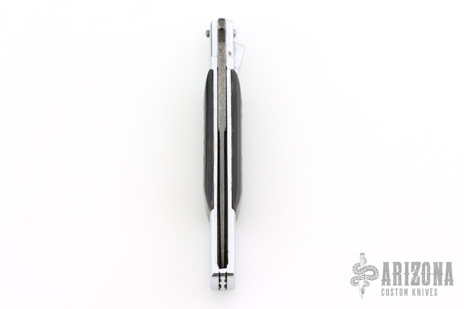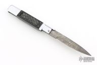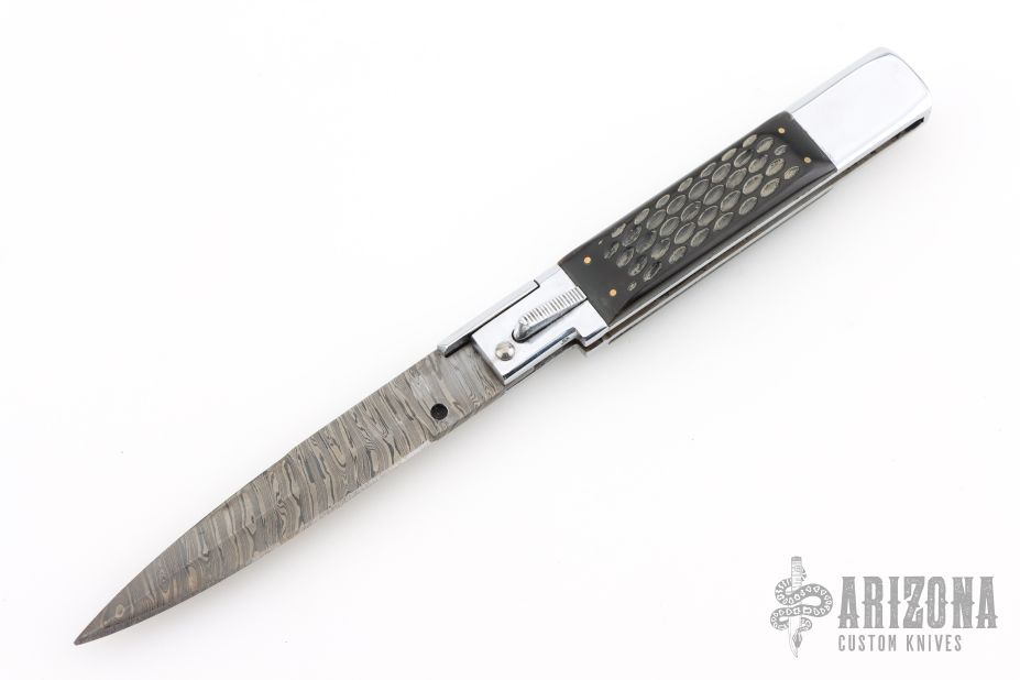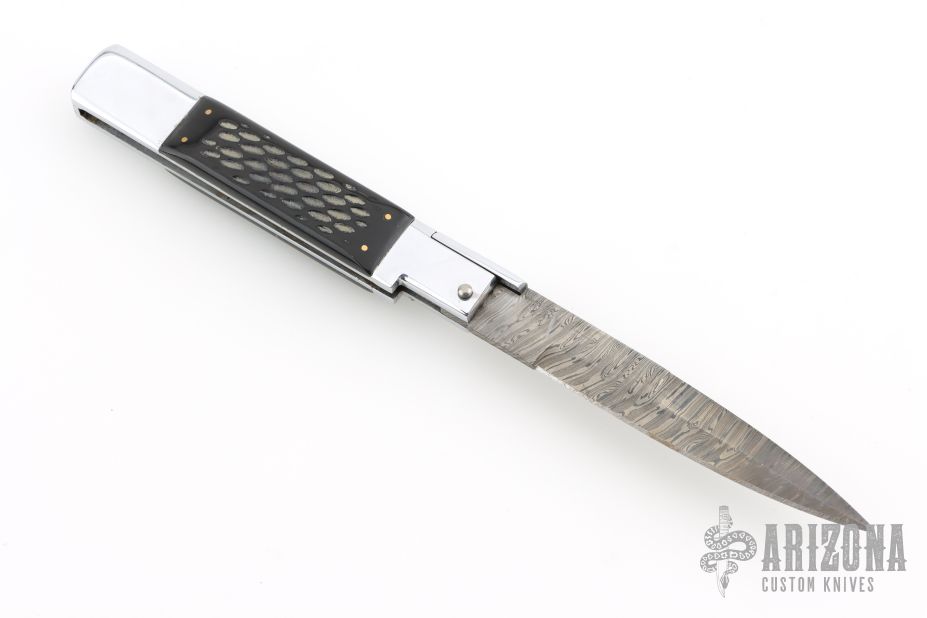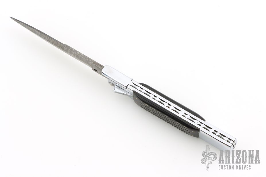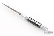This Picklock Auto by Agasi Hambartsumian of Armenian Doctor Knives features a Damascus bayonet ground blade with a false top edge. The handle has a polished stainless steel frame with fileworked stainless steel backspacer, jigged buffalo horn scales with brass pins. New from maker.