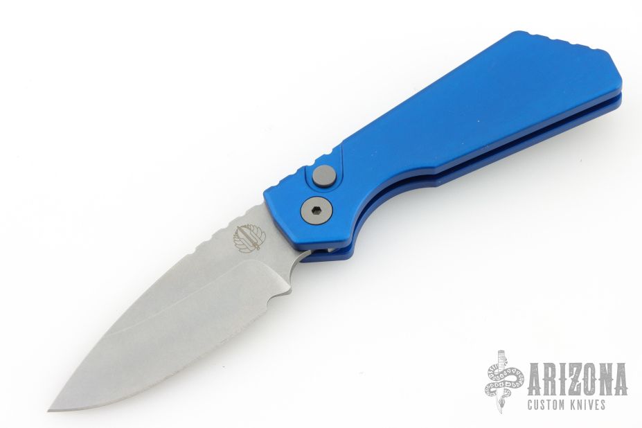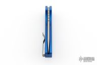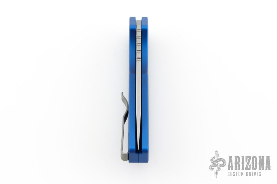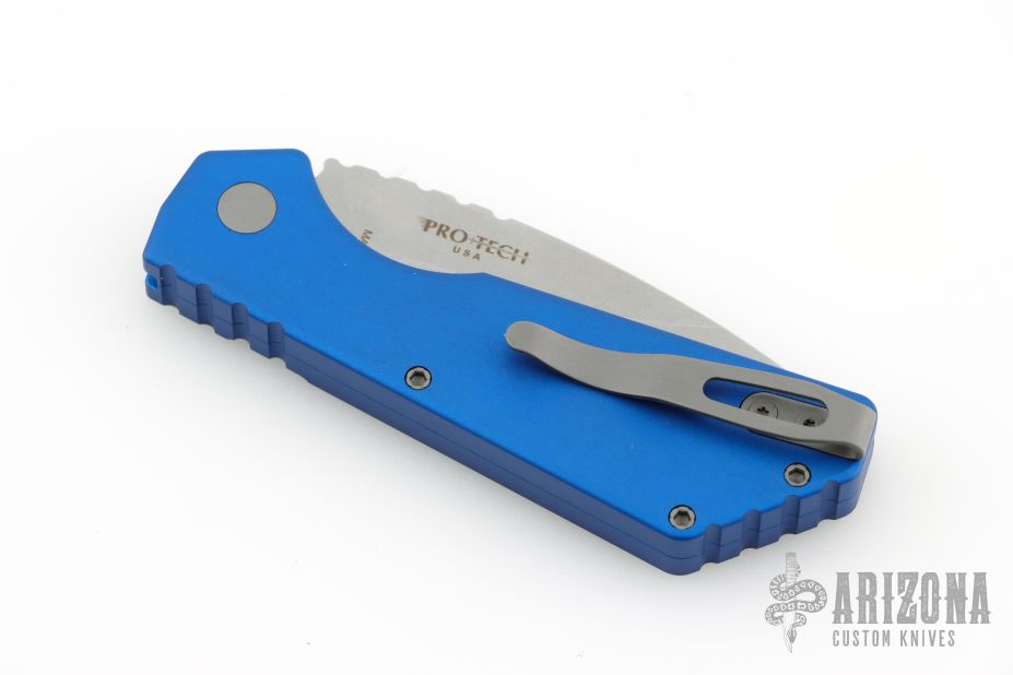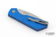 This Pro-Strider PT by Pro-Tech and Strider Knives features a tumbled finished blade with notched thumbrest. The handle has a blue aluminum frame with bead blasted hardware and black stainless steel tip up clip. Includes the original box, pouch, and papers. Excellent condition.