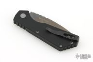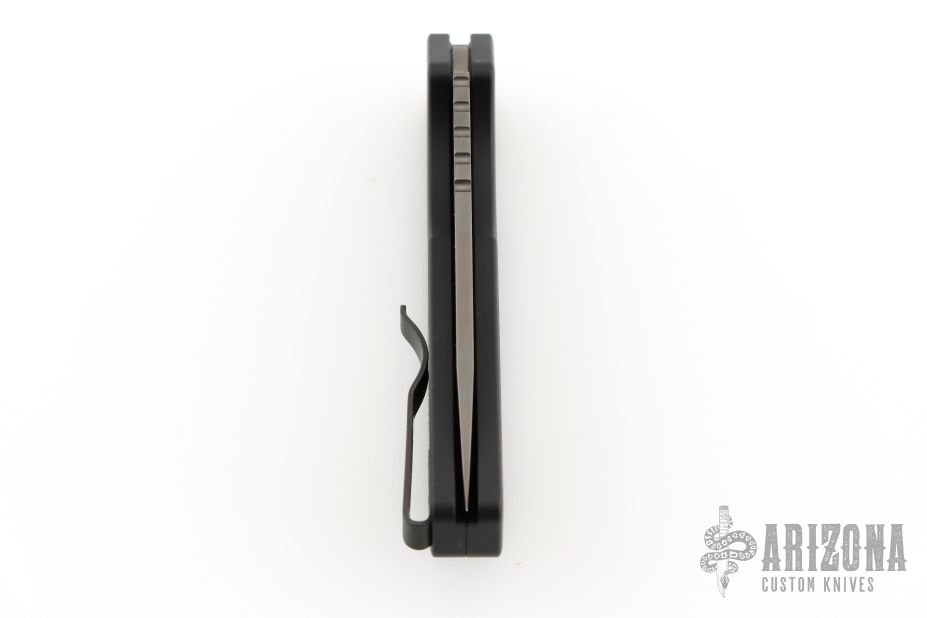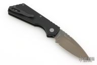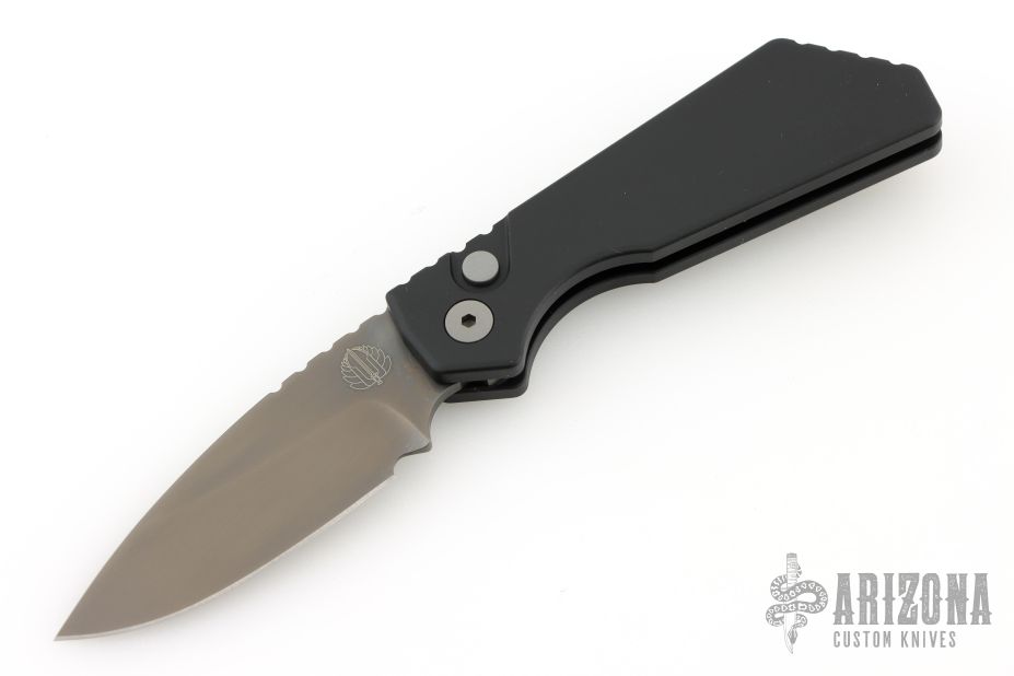 This Pro-Strider PT by Pro-Tech and Strider Knives features a Smokey Grey DLC blade with notched thumbrest. The handle has a black aluminum frame with black hardware and black stainless steel tip up clip.  Black push button. Comes with original box, pouch, and papers. Excellent Condition.
