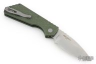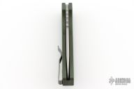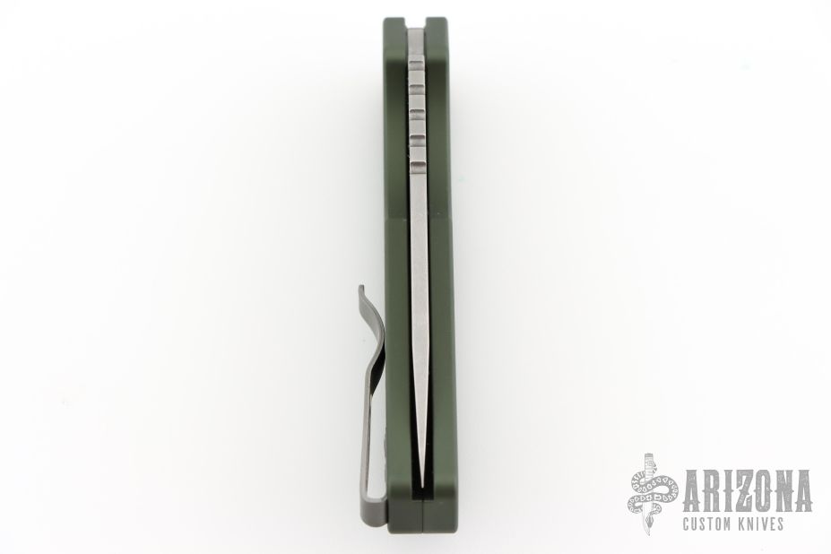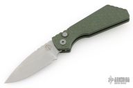 This Pro-Strider PT by Pro-Tech and Strider Knives features a stonewashed drop point blade with notched thumbrest. The handle has a textured green aluminum frame with bead blast finished hardware and stainless steel tip up clip.  Includes the original box, pouch, and papers. Has a light scuff on the clip. Excellent condition.