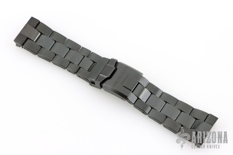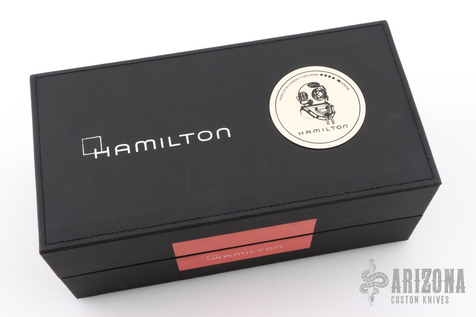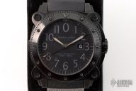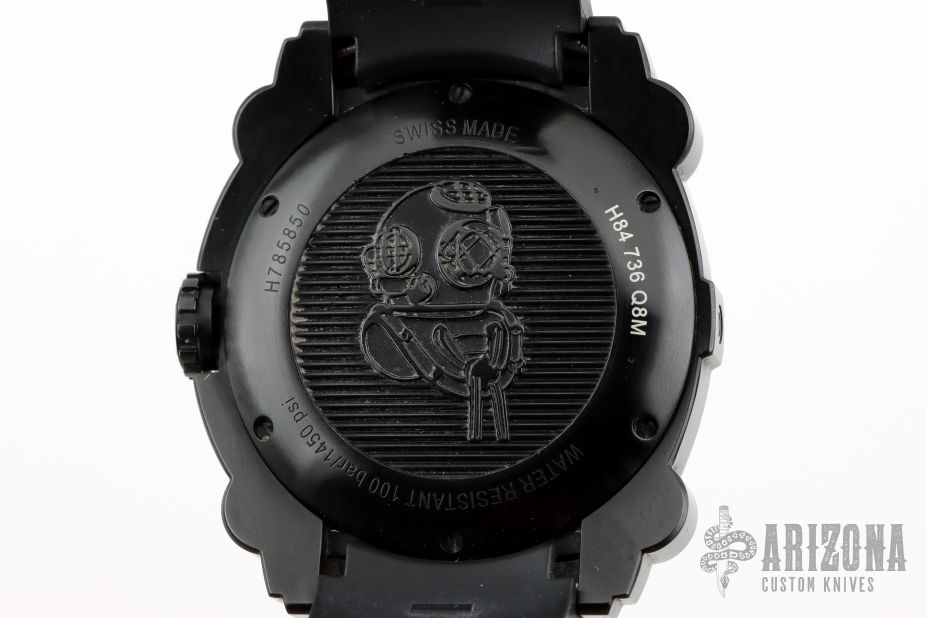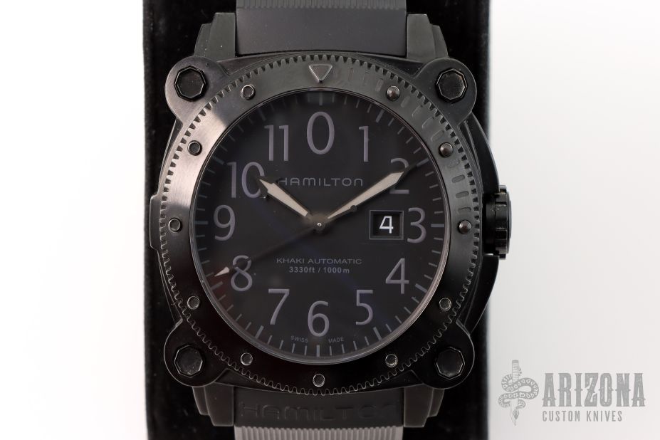Pvd black titanium case with a black rubber strap. Pvd black titanium bezel. Black dial with black hands and Arabic numeral hour markers. Minute markers around the outer rim. Dial Type: Analog. Luminescent markers. Caliber H-10 automatic movement. Scratch resistant sapphire crystal. Screw down crown. Solid case back. Round case shape, case size: 46 mm. Band width: 22 mm. Tang clasp. Water resistant at 100 meters / 330 feet. Functions: hour, minute, second. Khaki Navy Series. Watch label: Swiss Made. Hamilton Khaki Navy Automatic Black Dial Men's Watch H785850. H84368M.