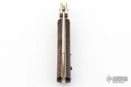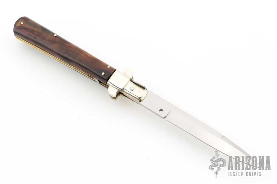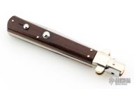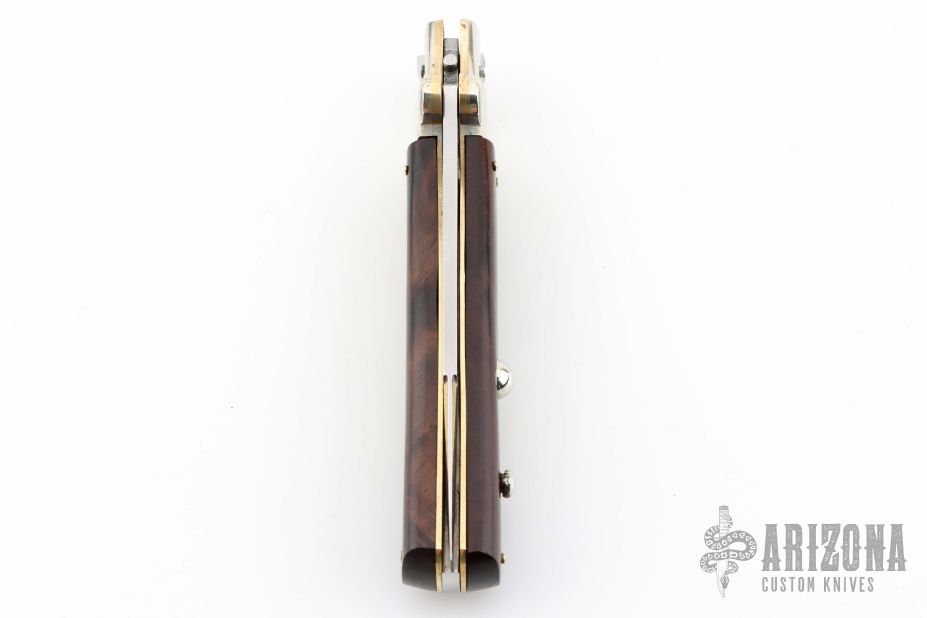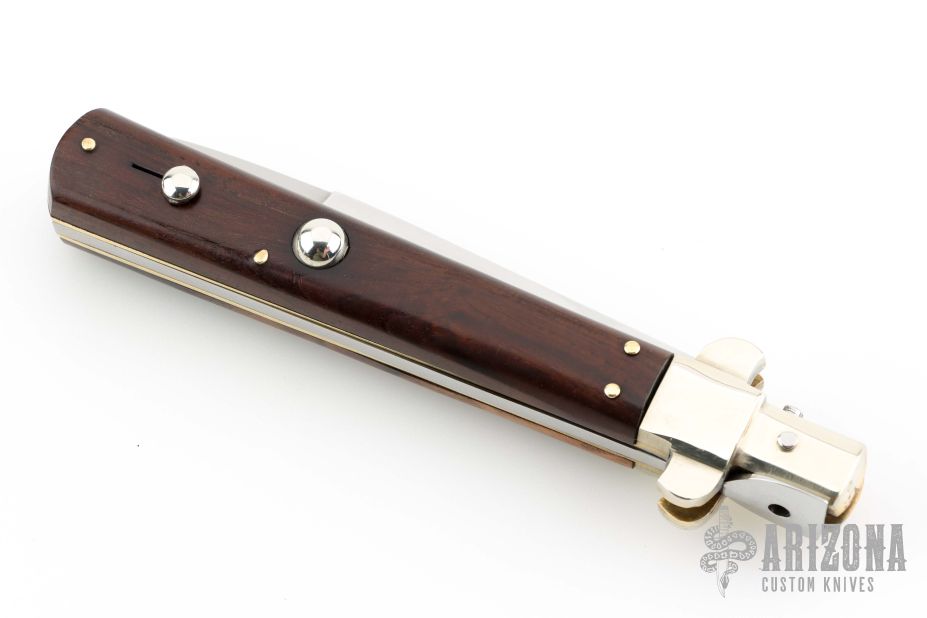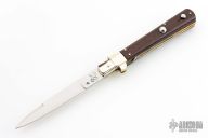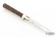 This Frosolone Auto by Renzo Passcotto features a mirror finished blade with false top edge. The handle cocobolo scales, brass liners and nickel silver bolsters. Has safety. Includes a leather slip sheath and COA. Excellent Condition.