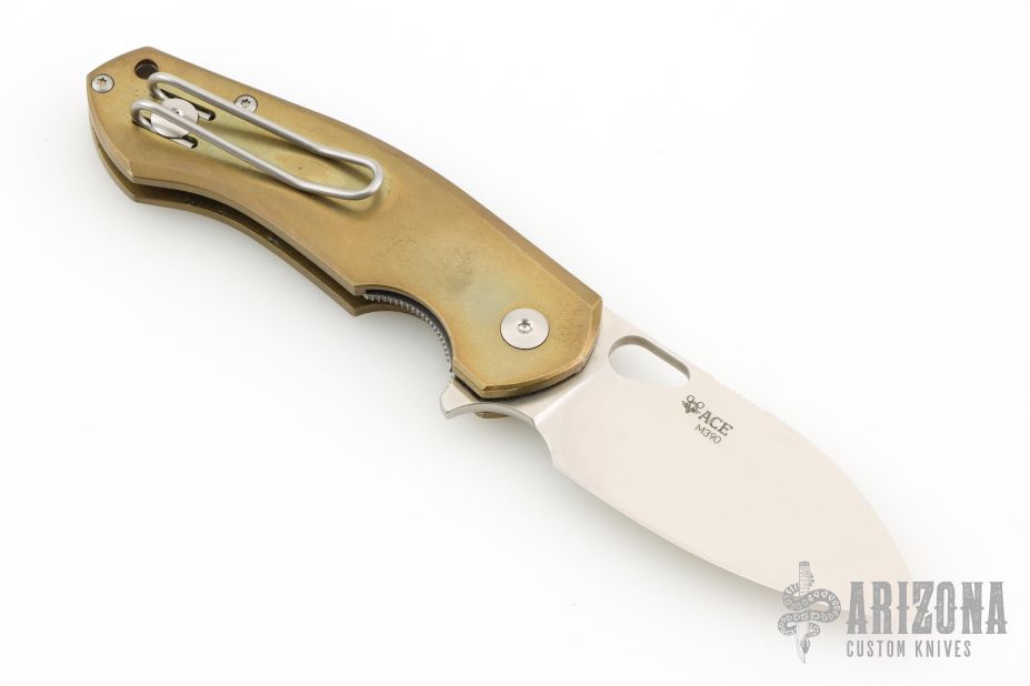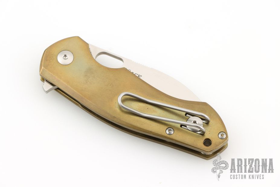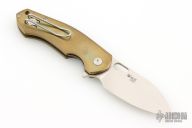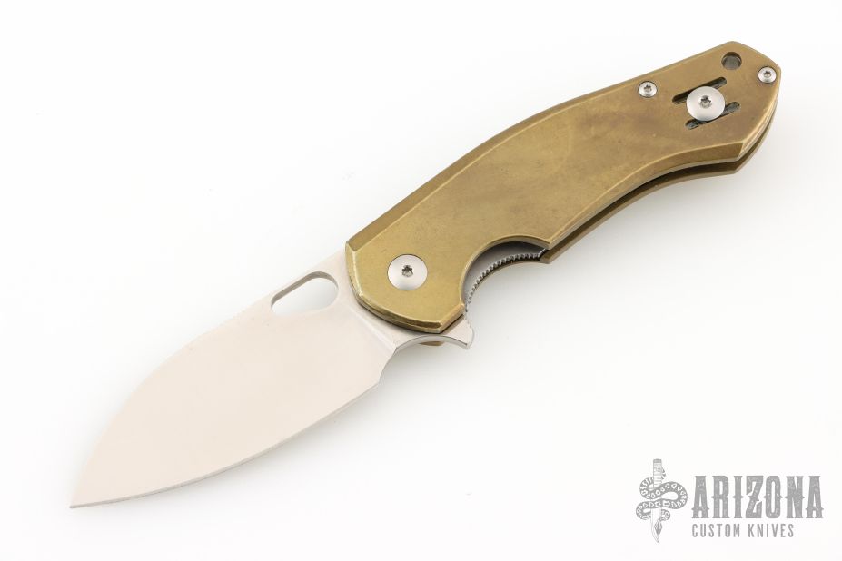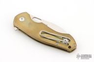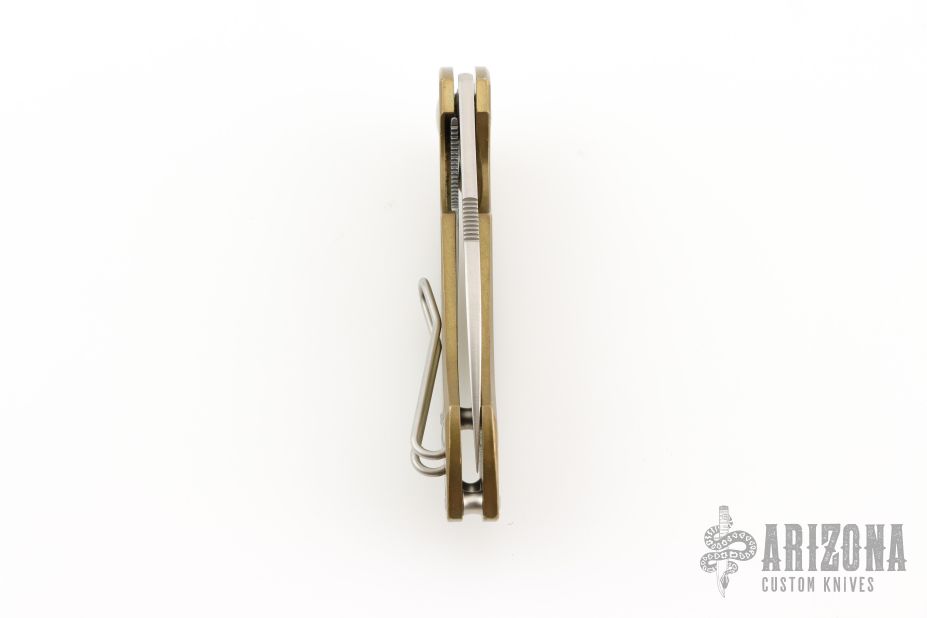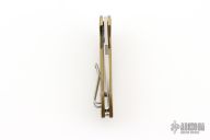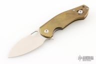 This AICE BIBLIO by Giant Mouse features a satin finished drop point blade with thumb hole and notched thumb rest. The handle is comprised of a tumbled brass frame with a stainless tip up pocket clip. Comes with the original box. There are some light scratches on the handle, and a light patina. There are also some light scratches on the blade. Great overall condition.