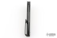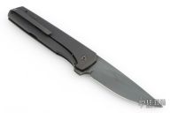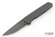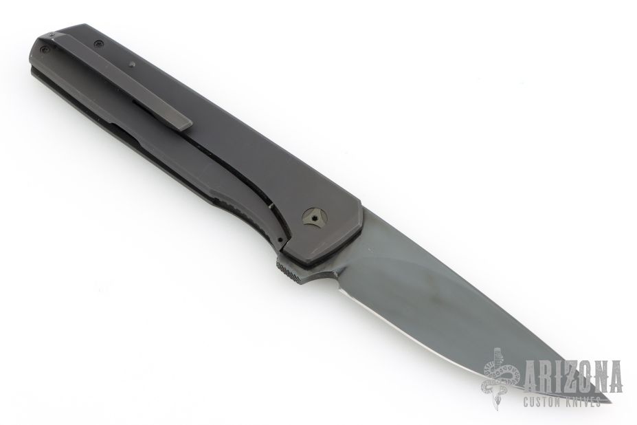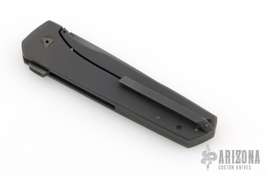 This Iridium flipper by JD Van Deventer features a black hand rub satin finished blade with a notched flipper. The handle has a black titanium frame and tip up titanium clip with hidden screws, blackwood carbon fiber backspacer. Comes with zippered case. Has some scuffs, otherwise excellent condition. Nice detent, lockup and blade seating.