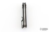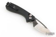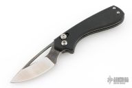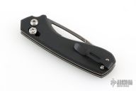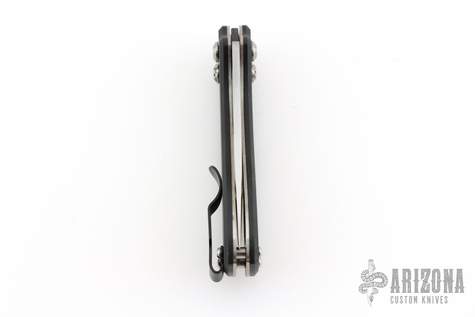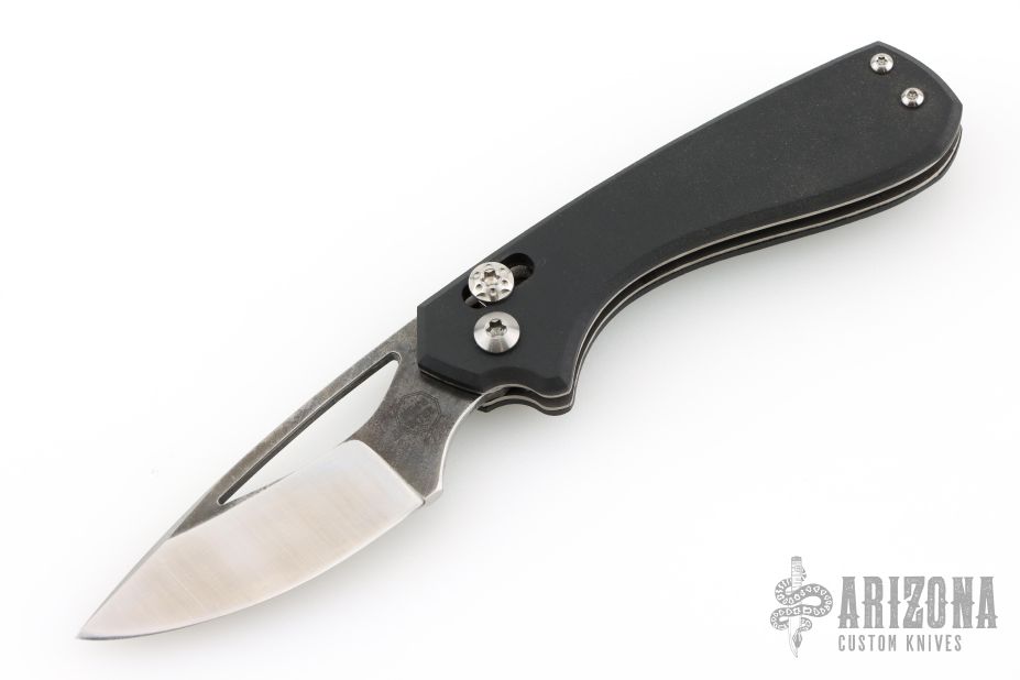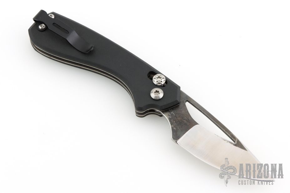 This knife by Bryan Kohn features a two-tone blade with thumbhole. The handle has black paper micarta scales, titanium liners, tip up black stainless steel clip. Comes with a zippered case. Excellent condition.