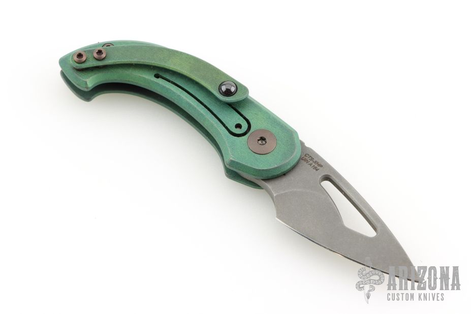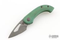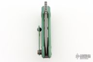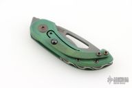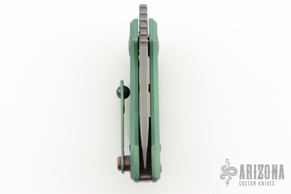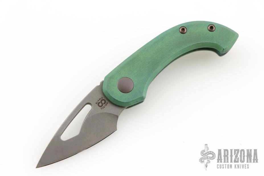 This Appetizer from Olamic Cutlery features a stonewash finished blade, thumbhole, notched thumbrest and front flipper. The titanium frame has a Rainforest texture and green anodizing, matching pocket clip is positioned for tip up carry, fileworked titanium backspacer. Comes with makers card with a serial number of 164 and dated 10/21/2025. Includes a padded zippered case. Excellent condition. Comes with an additional backspacer with a bottle opener, and a silver skull bead.