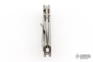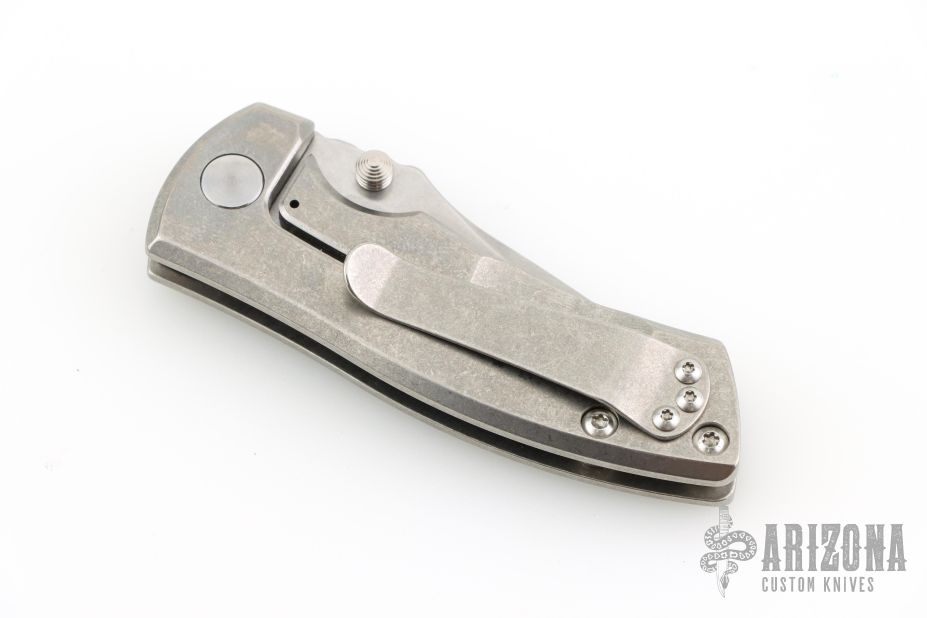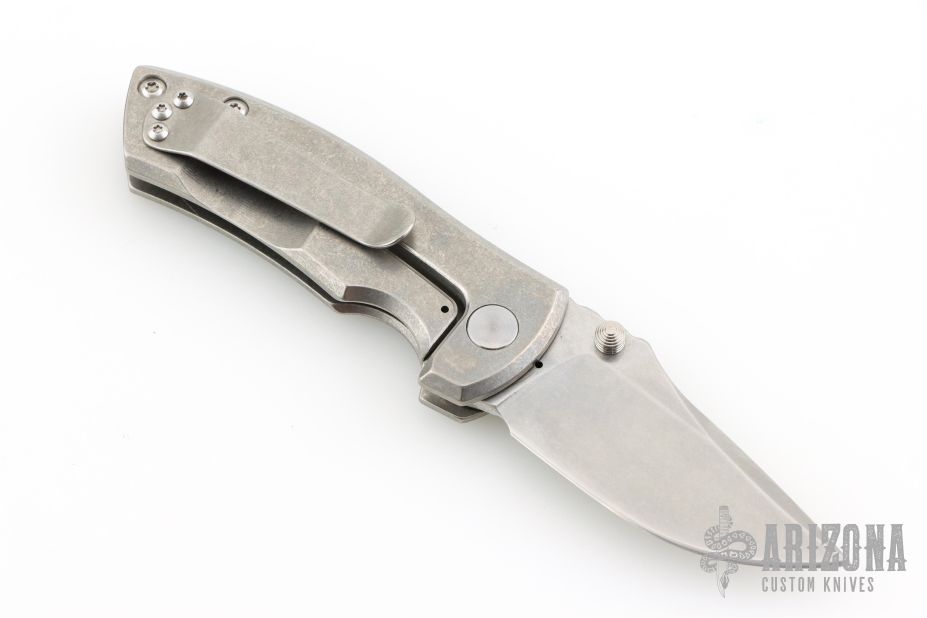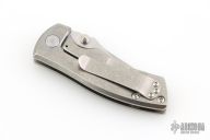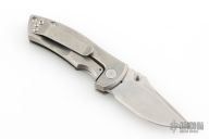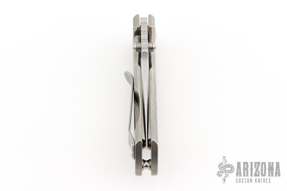 This ESV by Les George features a tumble finished Magnacut blade with notched thumbrest and dual thumbstuds, the flipper has been deleted and thumbstuds added. The handle has a stonewashed titanium frame and titanium pocket clip for tip up carry. Smooth function with nice blade seating, lockup and detent. Excellent condition. Comes with a zippered case and Skiff washers. Currently riding on Skiff bearings.
