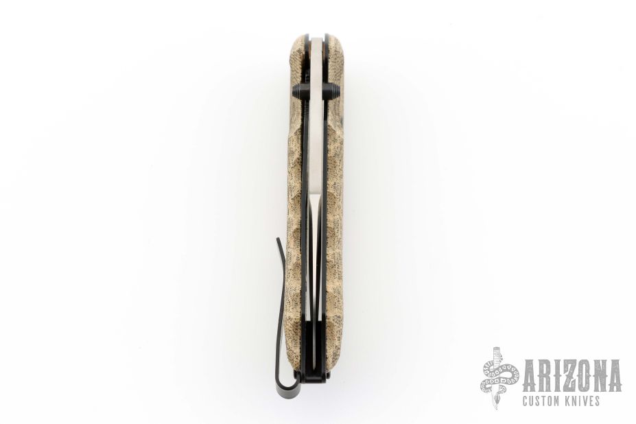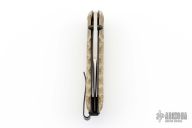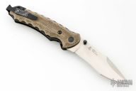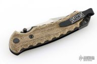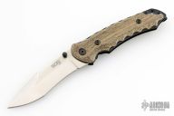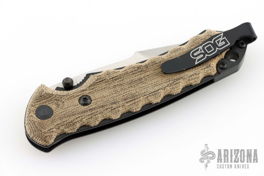 This Kiku linerlock by SOG Knives features a satin finished recurve tanto blade with dual thumbstuds and a notched thumb ramp.  The handle features micarta scales over black steel liners with a matching tip up pocket clip. There is a scuff on the clip. Excellent Condition.