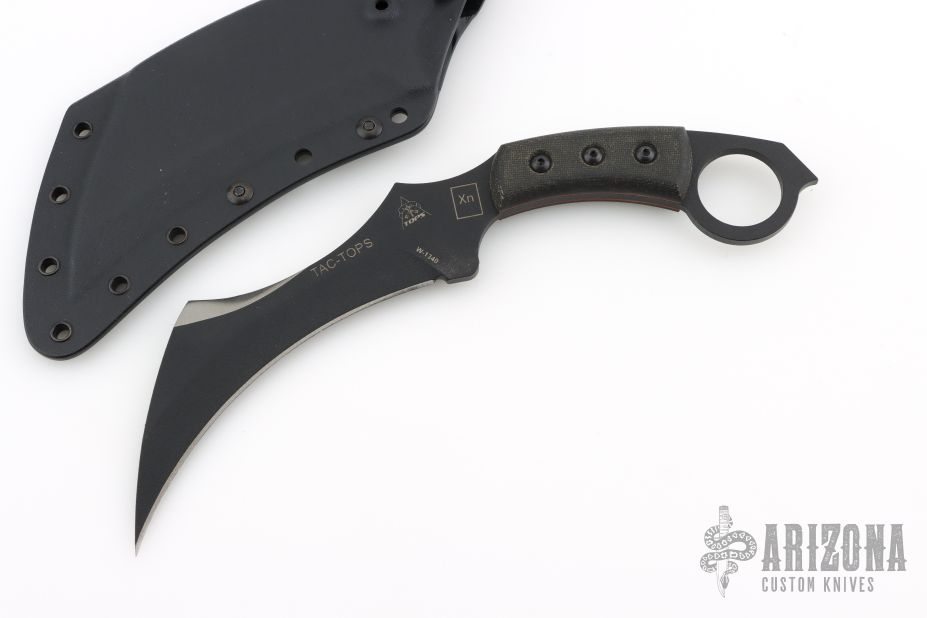 The TAC-TOPS Karambit offers an intimidatingly large hawksbill blade with a unique top edge grind for added cutting power. An oversized finger hole and micarta handle scales provide a tactical grip in the harshest conditions. The TAC-TOPS was designed by C. Despins of Max Venom Product Group and produced by Tops Knives for a highly elite military unit.