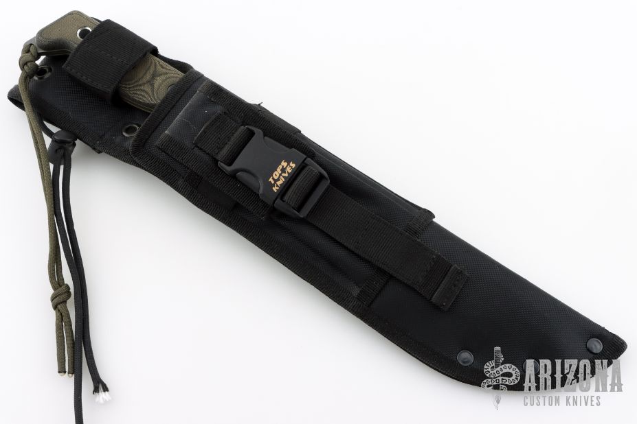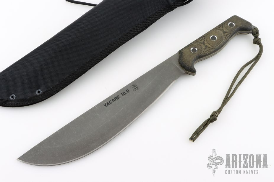 The Yacare 10.0 Machete takes inspiration from the classic jungle machetes of the Costa Rican rainforest. It is similar to barong styled machetes but with that distinctive TOPS flair. Designed by TOPS GM Craig Powell, this heavy duty fixed blade will serve you well in any difficult environment. It's medium size allows for comfortable carry yet is heavy duty enough for any difficult task. Item comes equipped with a durable nylon belt sheath. The TOPS Yacare 10.0 is perfect for camping, hiking, or your next Bushcraft Global Adventure.