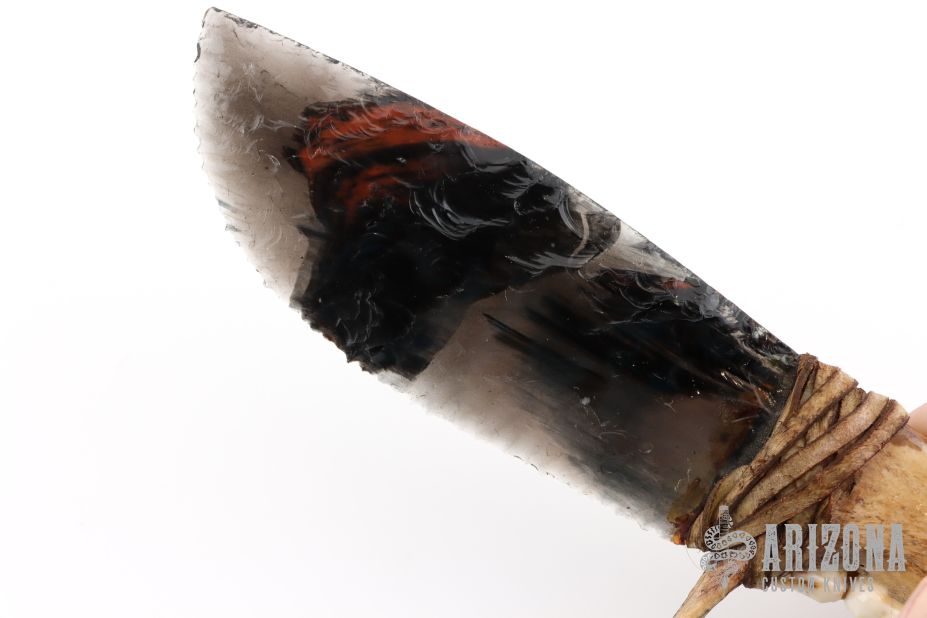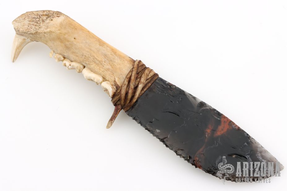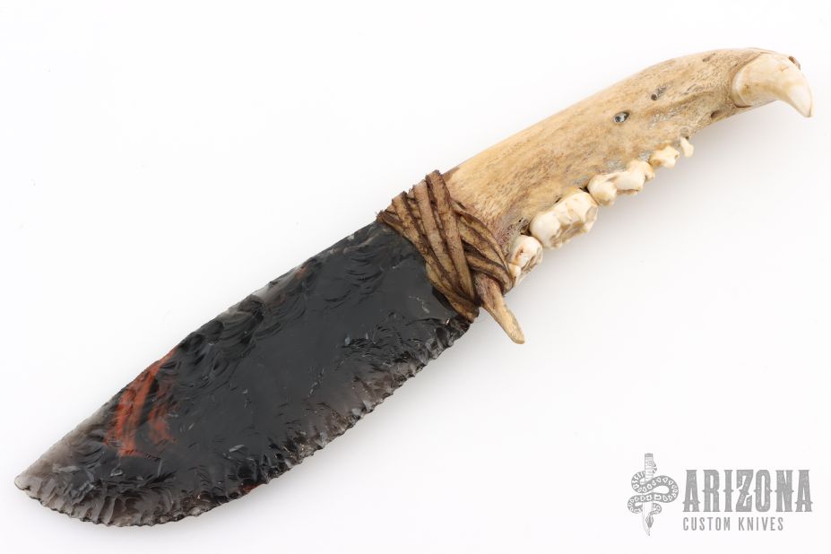 This knife features a flint knapped obsidian blade that has been attached to a jawbone with a sinew wrap. Includes a zipper case. Excellent condition.