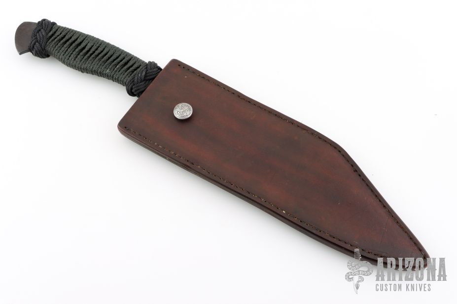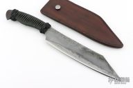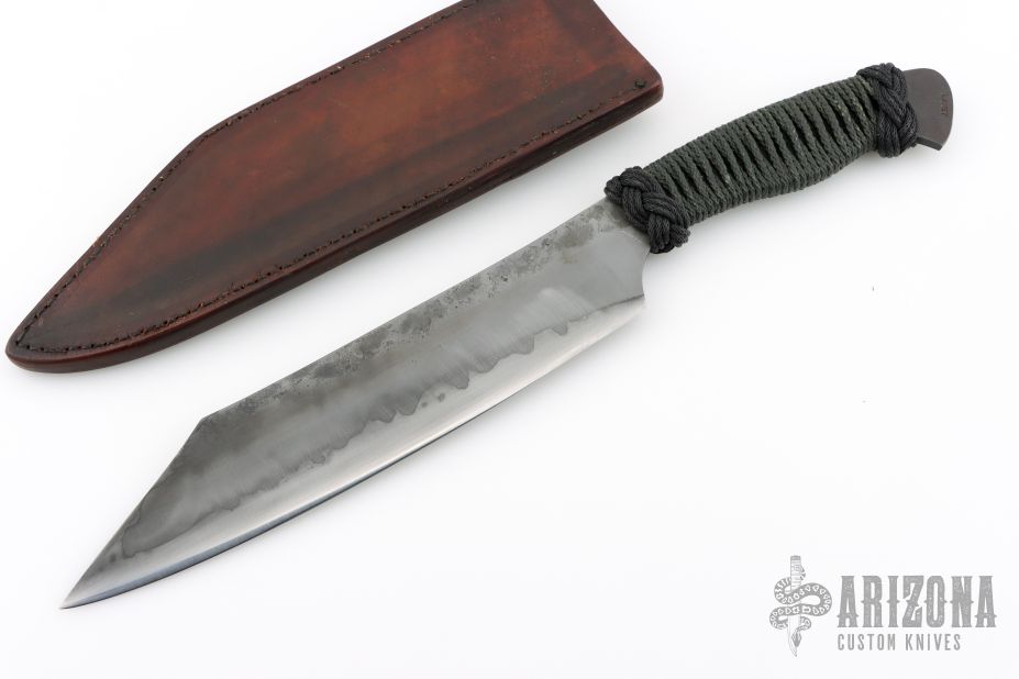 This knife by Matt Lamey features a chopper style blade with nice hamon, .240" blade stock and 2.290" blade depth, full tang construction. The handle has epoxied cord wrap. Comes with a brown leather sheath. Has some scratches, has been used, otherwise good condition. One of a kind.