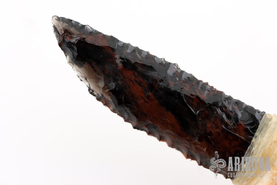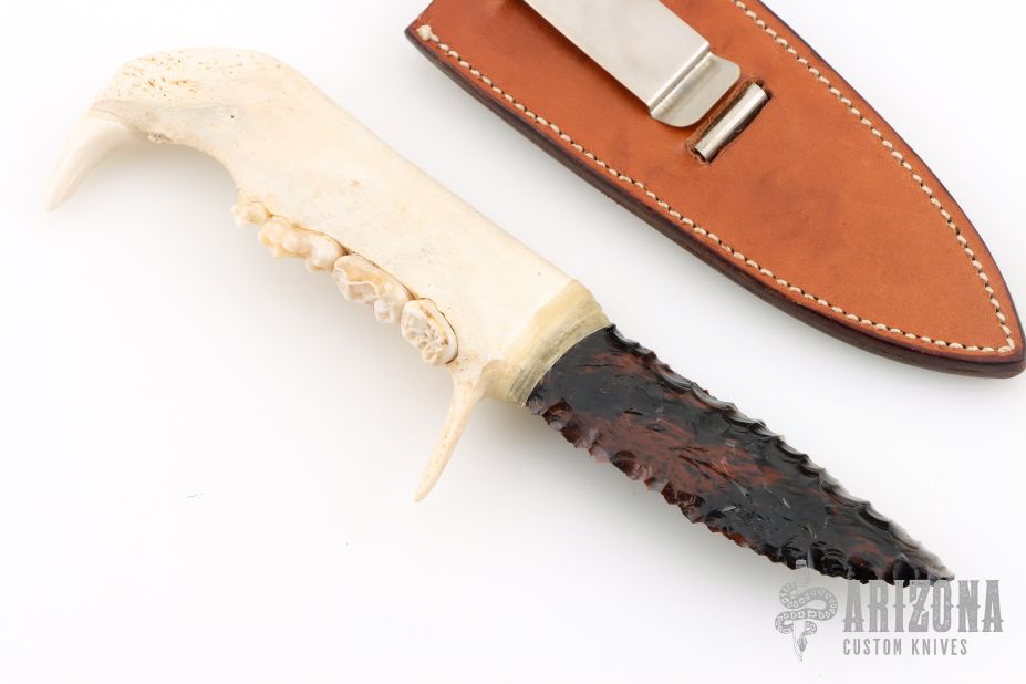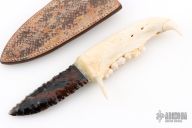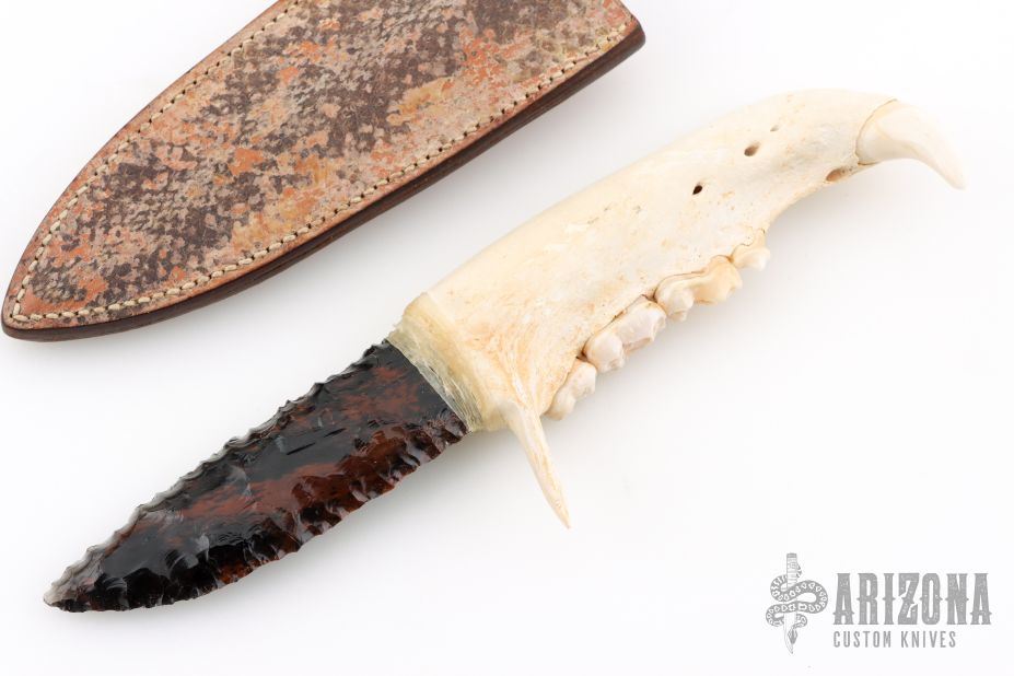 This knife features a flint knapped obsidian blade that has been attached to a jawbone with a sinew wrap. Includes a brown leather sheath. Excellent condition.