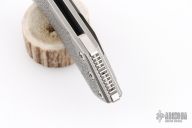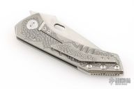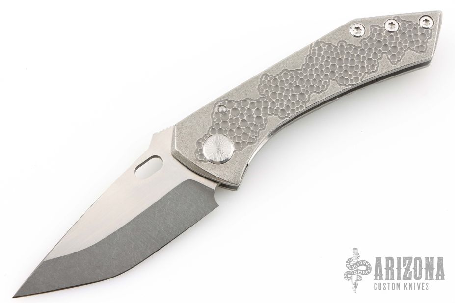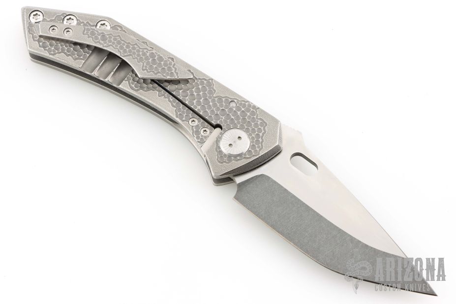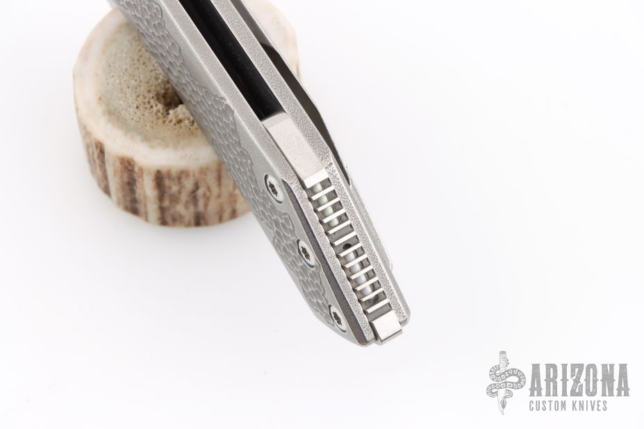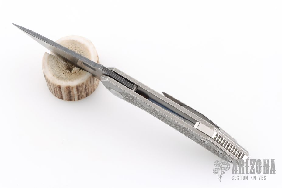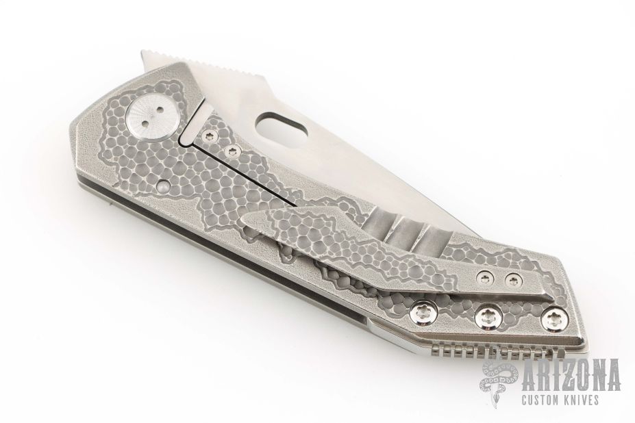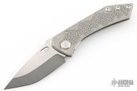 This knife by Sergey Rogovets features a two-tone tanto blade with thumbhole and notched thumbrest. The blade material is Elmax. The handle has a carved and orange peel finished titanium frame, titanium backspacer with two trit inlays, and a matching tip up titanium clip. Nice detent, lockup and blade seating. Excellent condition. Comes with original box and papers dated February 2019.