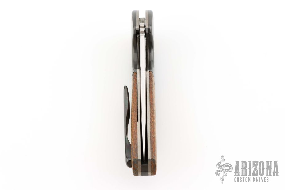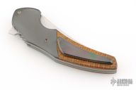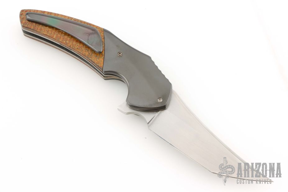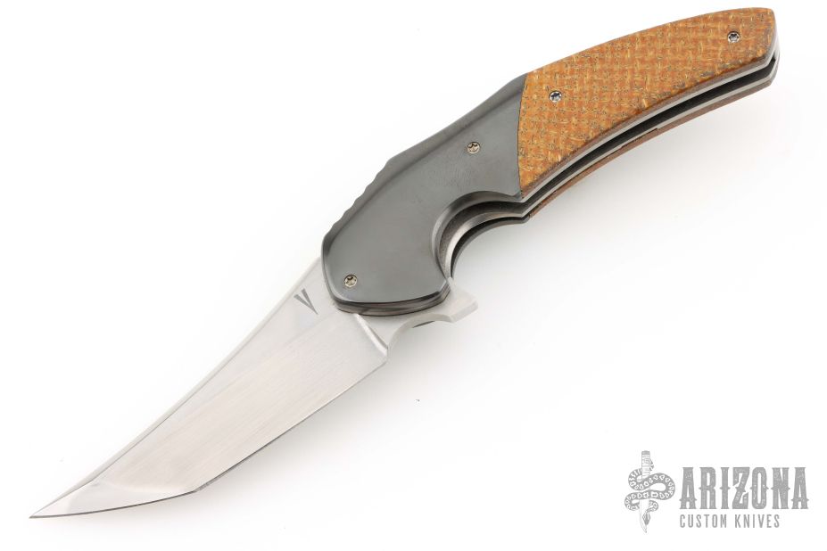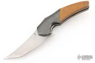 This 3.5" Instigator #7 by Jeff Vandermeulen features a hand rub satin finished blade with flipper. The handle has zirconium bolsters, thunderstorm kevlar scales, tumble finished titanium liners. tip up zirconium clip with hidden hardware, zirconium backspacer. Rides on bearings, nice detent, lockup and blade seating. Excellent condition.