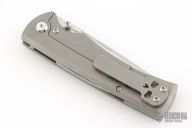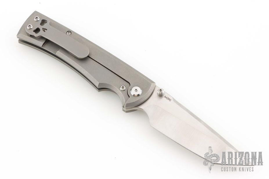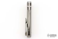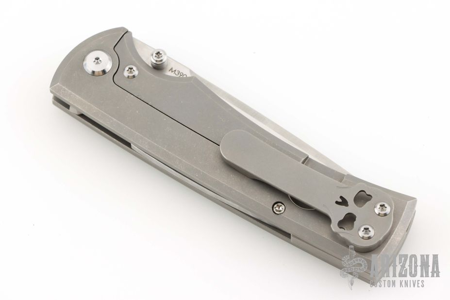 This Chaves Ultramar Liberation Tanto has been professionally converted to a side-opening automatic by Kyle Vallotton. It features a satin finished blade with the Chaves logo, a tumbled titanium frame with skull pocket clip positioned for tip-up carry, and a matching titanium backspacer. Additional details include a Mokuti push button and jeweled steel backspring. The knife comes with its original box and a spare titanium pocket clip, and is offered new from the maker.