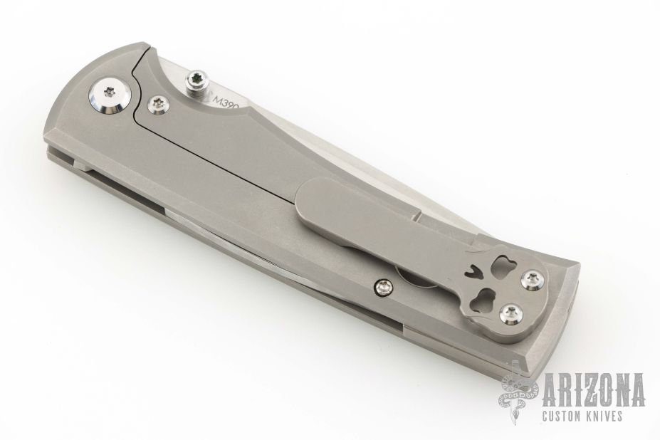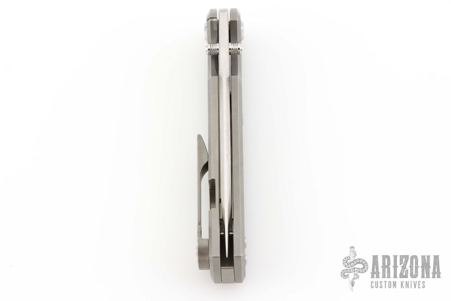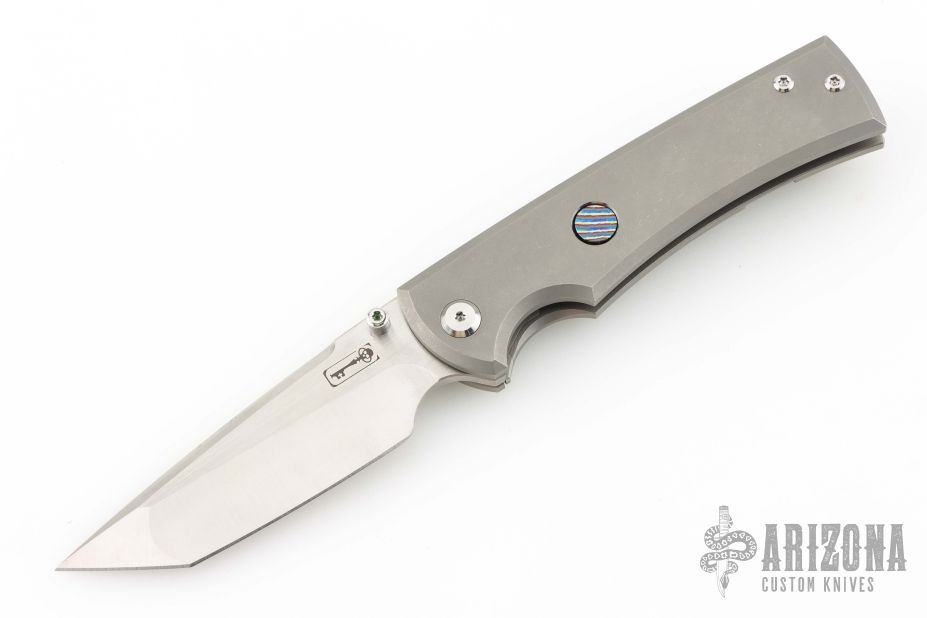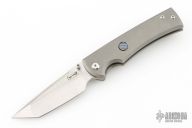 This Chaves Ultramar Liberation Tanto has been professionally converted to a side-opening automatic by Kyle Vallotton. It features a satin finished blade with the Chaves logo, a tumbled titanium frame with skull pocket clip positioned for tip-up carry, and a matching titanium backspacer. Additional details include a Mokuti push button and jeweled steel backspring. The knife comes with its original box and a spare titanium pocket clip, and is offered new from the maker.