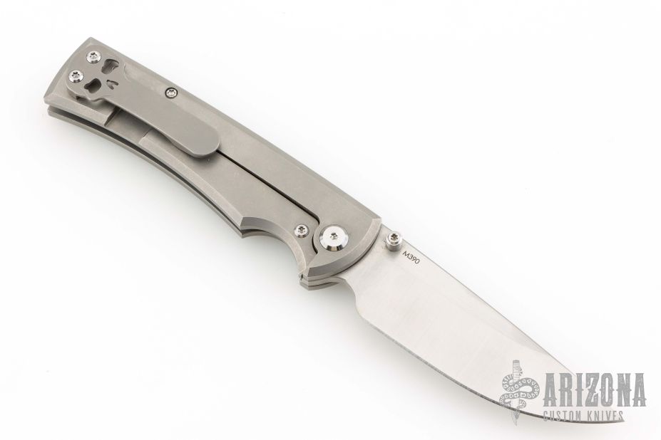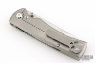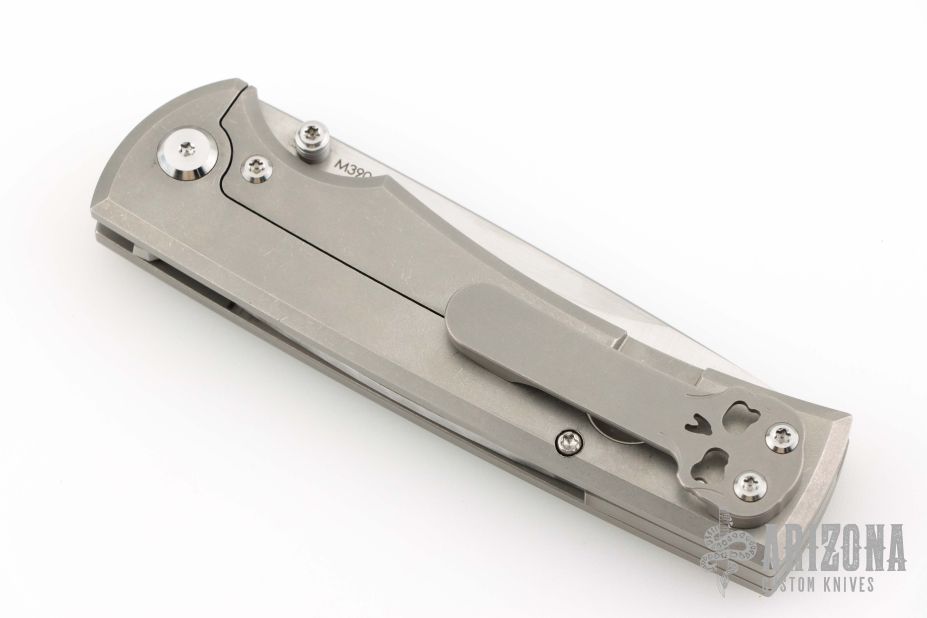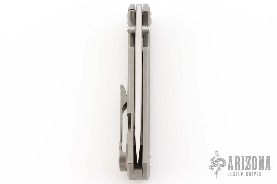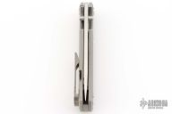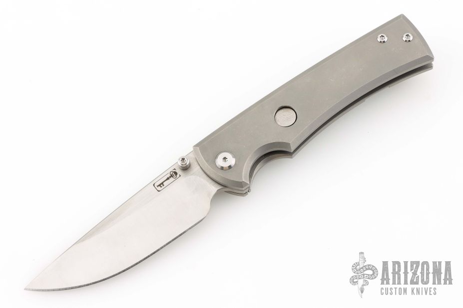 This Chaves Ultramar Liberation drop point has been professionally converted to a side-opening automatic by Kyle Vallotton. It features a satin finished blade with the Chaves logo, a tumbled titanium frame with skull pocket clip positioned for tip-up carry, and a matching titanium backspacer. Additional details include jeweled steel backspring. The knife comes with its original box and a spare titanium pocket clip, and is offered new from the maker.