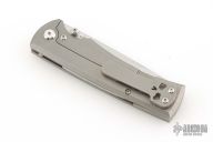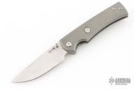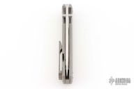 This Chaves Ultramar Liberation drop point has been professionally converted to a side-opening automatic by Kyle Vallotton. It features a satin finished blade with the Chaves logo, a tumbled titanium frame with skull pocket clip positioned for tip-up carry, and a matching titanium backspacer. Additional details include jeweled steel backspring. The knife comes with its original box and a spare titanium pocket clip, and is offered new from the maker.