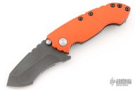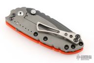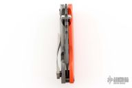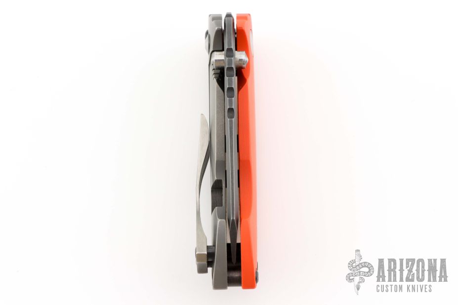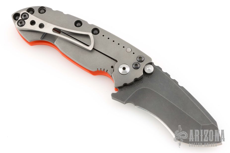 This Solo flipper by Direware features a tumble finished blade with notched thumbrest and dual thumbstuds. The handle has a blasted titanium and orange G-10 frame, titanium tip up pocket clip. Nice detent, lockup and blade seating. Has a couple light scratches, otherwise excellent condition. Comes with a Velcro case.