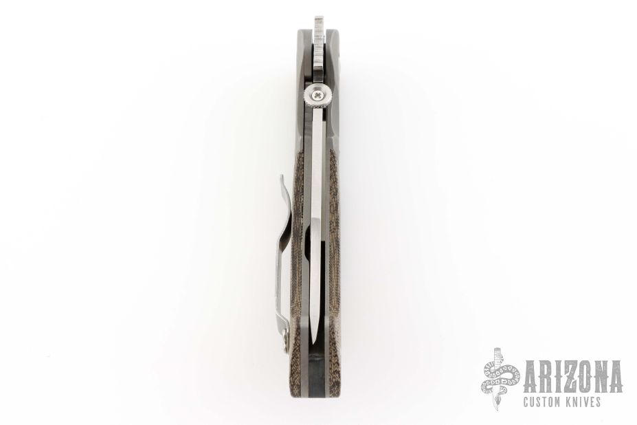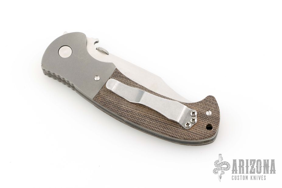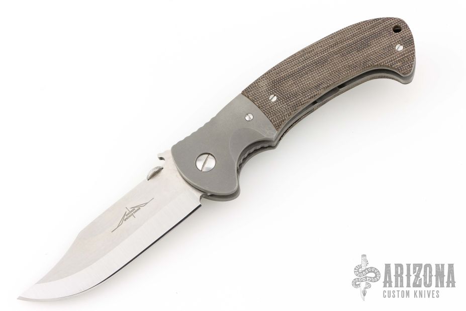 This custom CQC-13 by Emerson Knives features a hand-ground satin finish blade with notched thumbrest, thumbdisc and wave feature. The handle has bead blasted and dovetailed titanium bolsters and liners, green canvas micarta scales, black G-10 backspacer, stainless steel clip, tip up carry. Comes with an Emerson box and papers. Has some scuffs, the edge has been polished, otherwise excellent condition.