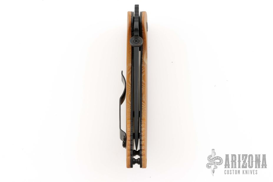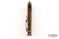 This PoBoy Commander by Andrew Charlet features a black cerakote blade with a thumbdisc, notched thumbrest and wave feature. The handle has vintage crosscut Butternut linen micarta scales, black cerakote titanium liners and a tip up stainless steel clip. Comes with original black G-10 scales. Excellent condition.