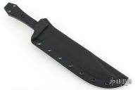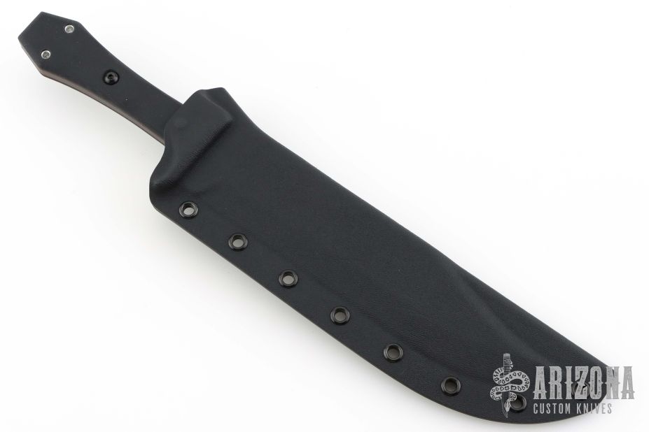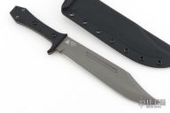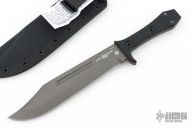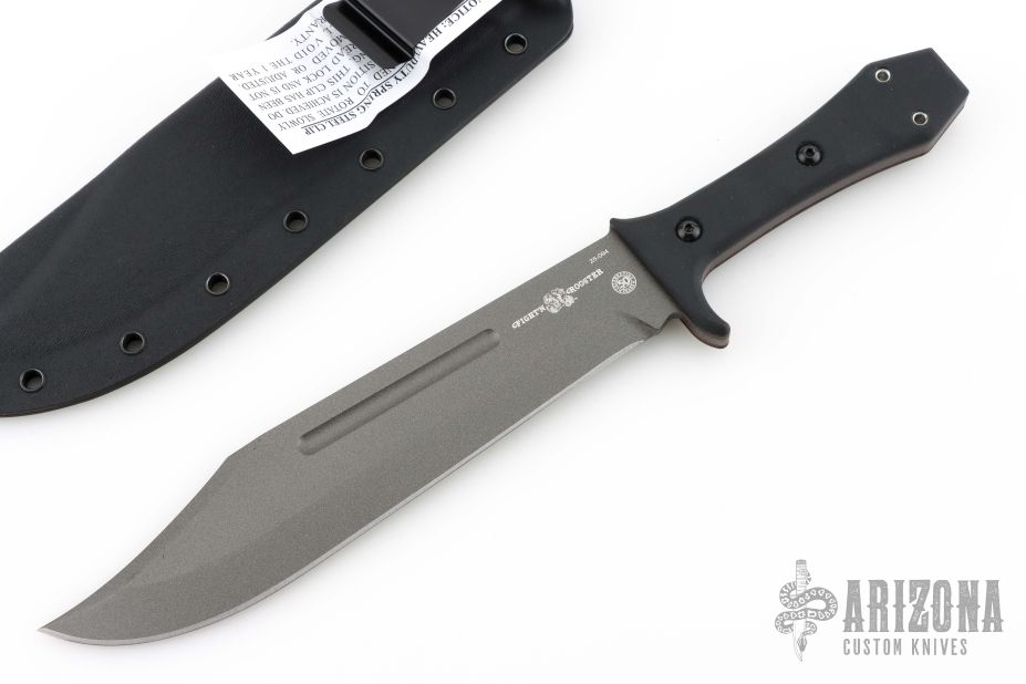This Walkabout Bowie by Tops and Sterling F. Buster Cutlery Co. was made for Fight'n Rooster. It features a Tungsten Cerakoted blade with fullers and false top edge, .188" blade stock and 1.764" blade depth, full tang construction with black G-10 scales with red liners. Comes with a kydex sheath with belt clip, and original packaging. New from maker. #25-094