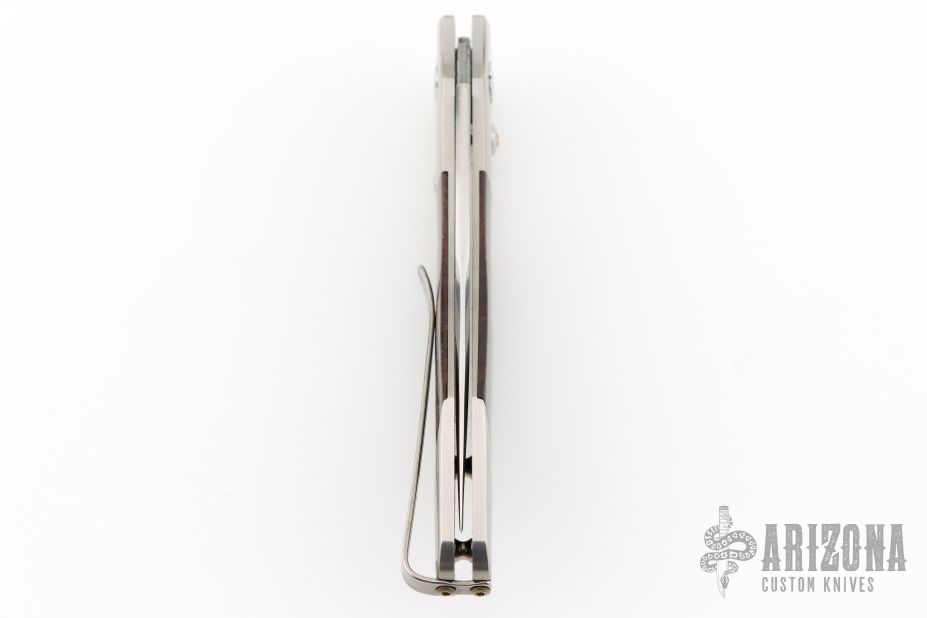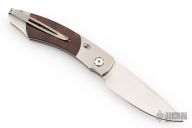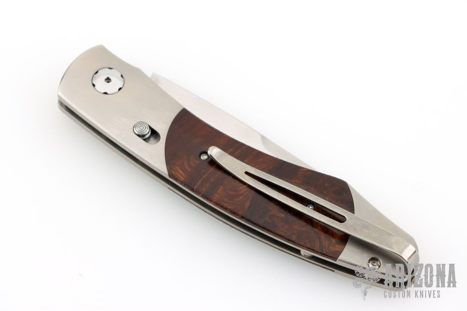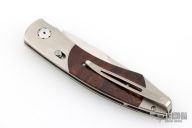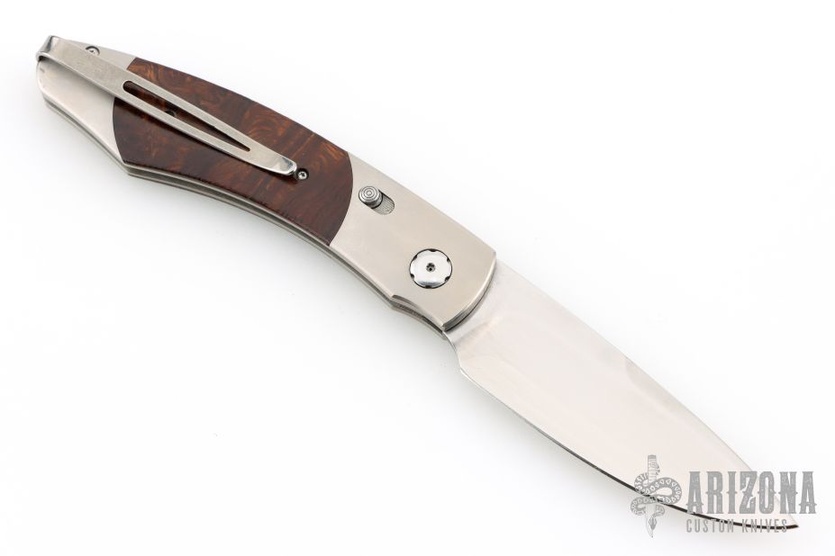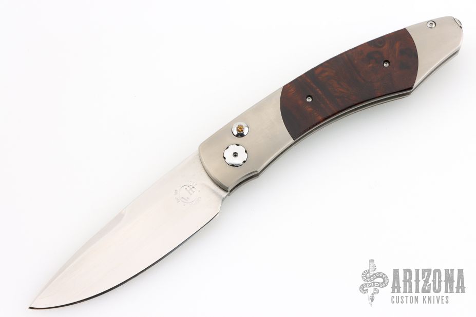 This limited edition Spearpoint automatic features a hand rub satin ZDP-189 core San Mai blade, satin titanium frame with desert ironwood inlays, tip up titanium clip. Includes a slide safety and citrine inlay in the push button. Comes with original box and COA dated July 5, 2007. Excellent condition.