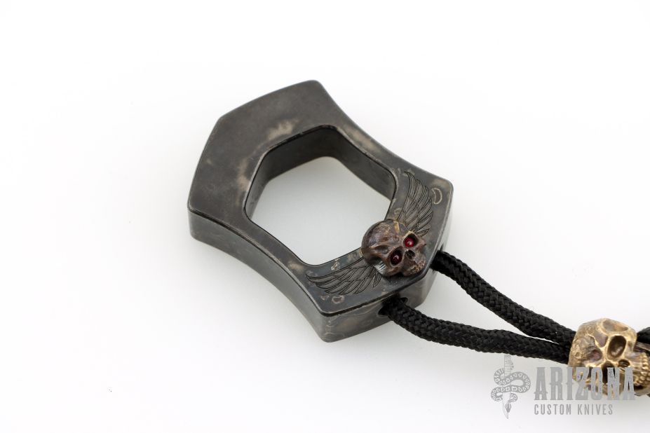 .469" thick Blackened titanium sledge with winged skulls and a silver skull with ruby eyes. Excellent condition.