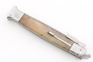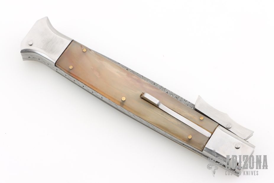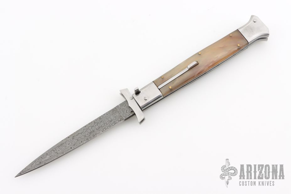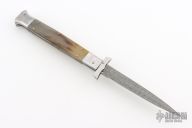 This 13" Swing Guard Auto by Samir Ahmad features a 3mm dagger ground Damascus blade with false top edge. The handle has stainless steel bolsters, front and rear, camel bone scales, steel liners, stainless spring. Excellent condition.