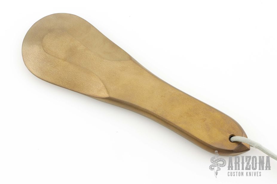 This Titanium Patu by the Jones Brothers is made of anodized and orange peel finished titanium. 9" long, 2.875" wide at the thickest end and 1.5" wide at the smaller end, a little over 1/2" thick. New condition.