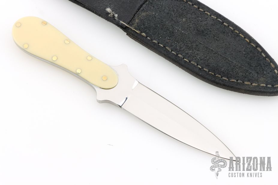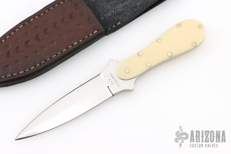 This dagger by RC Campbell features a polished dagger blade with .180" blade stock and .889" blade depth, full tapered tang construction. The handle has pinned paper micarta covers. Comes with a brown leather sheath. Has some light scuffs, and patina, great condition otherwise.