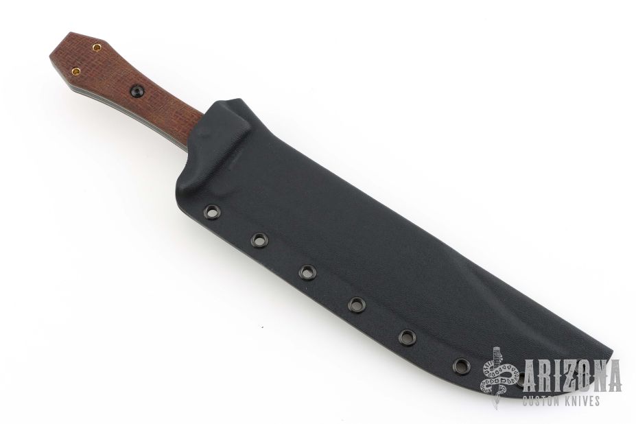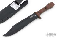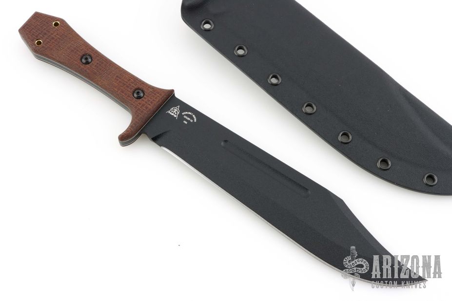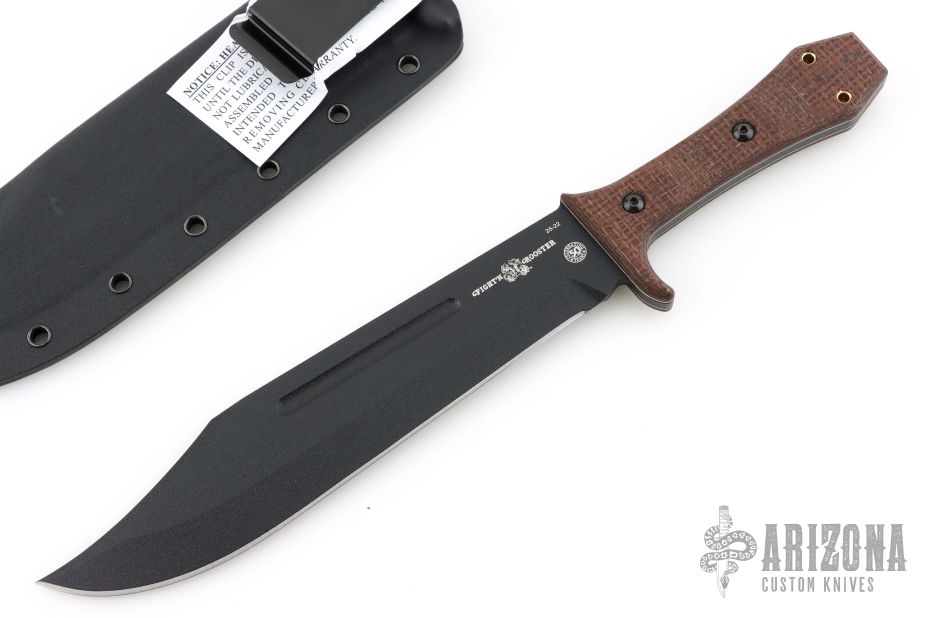 This Walkabout Bowie by Tops and Sterling F. Buster Cutlery Co. was made for Fight'n Rooster. It features a Black Traction Coated blade with fullers and false top edge, .195" blade stock and 1.759" blade depth, full tang construction with burlap micarta scales with white liners. Comes with a kydex sheath with belt clip, and original packaging. New from maker. #25-22