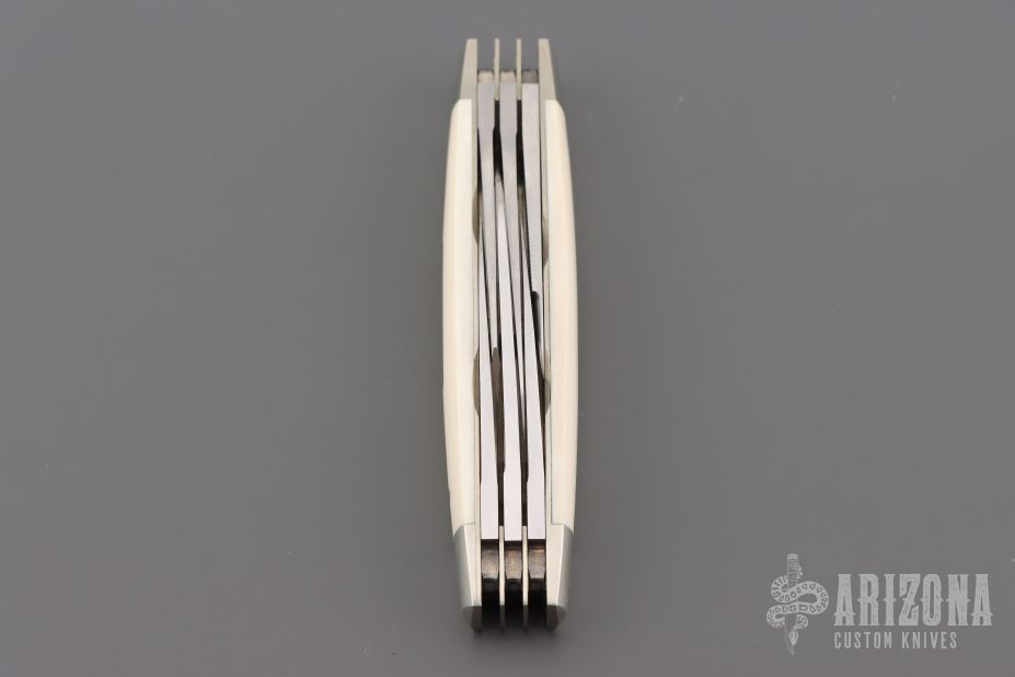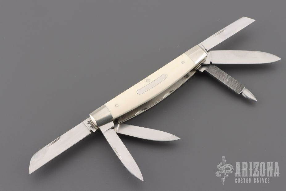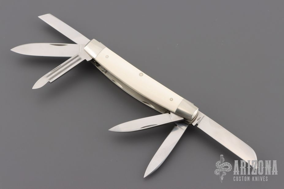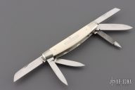 This Abe Lincoln 6-blade Congress Slipjoing by Eugene Shadley features hand rub satin finished blades with nail nicks. The handle has satin polished and pinched nickel silver double bolsters, mammoth ivory covers with a nickel silver escutcheon, nickel silver liners and stainless steel springs. #1454 on the blade. Comes with a Velcro case. Excellent condition. This was on the cover of Blade Magazine 5/22