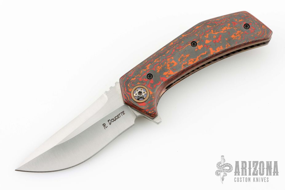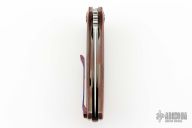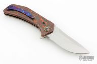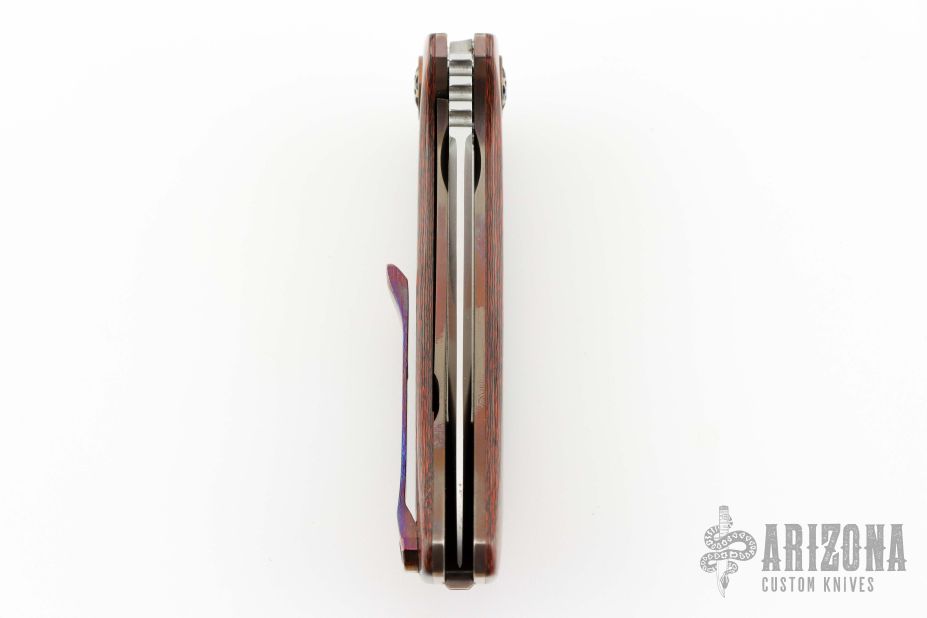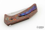 This Metalhead Flipper by Randy Doucette is a One-Off, it has a satin finished blade with a notched thumbrest and flipper. Handle has red/black fat carbon scales, copper pivot collars, anodized titanium liners and backspacer, tip up timascus clip. Nice detent, lockup and blade seating. Runs on bearings. Has a couple light scuffs, excellent condition otherwise.