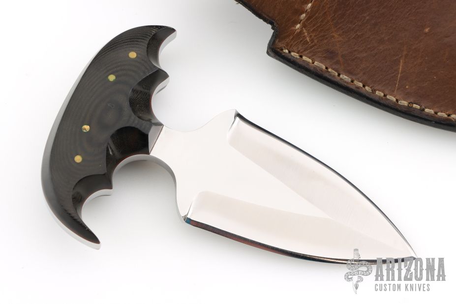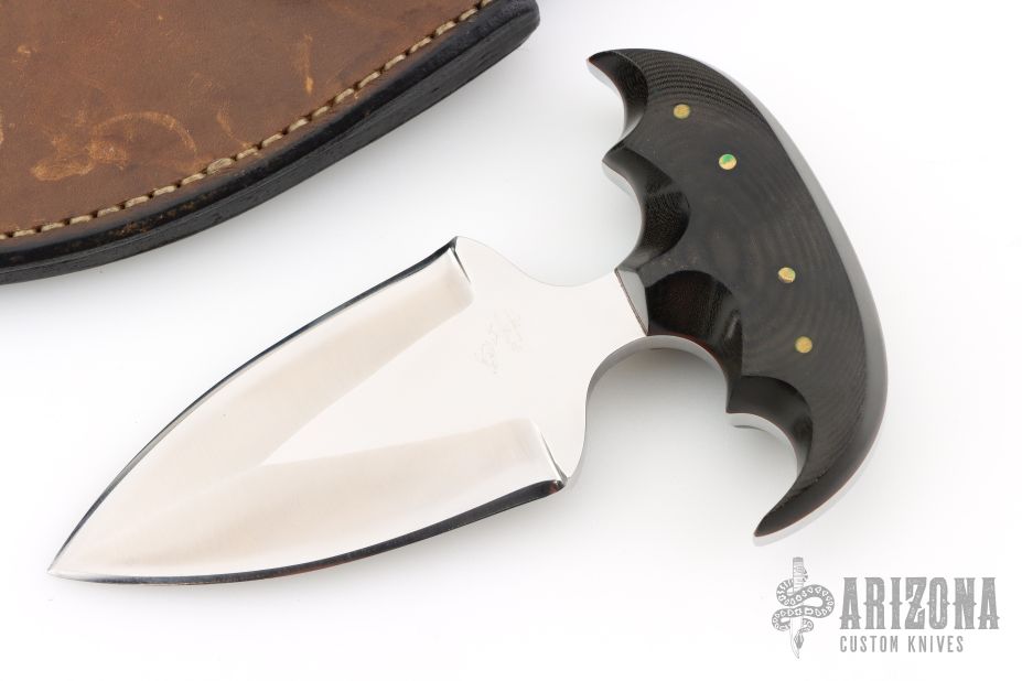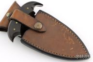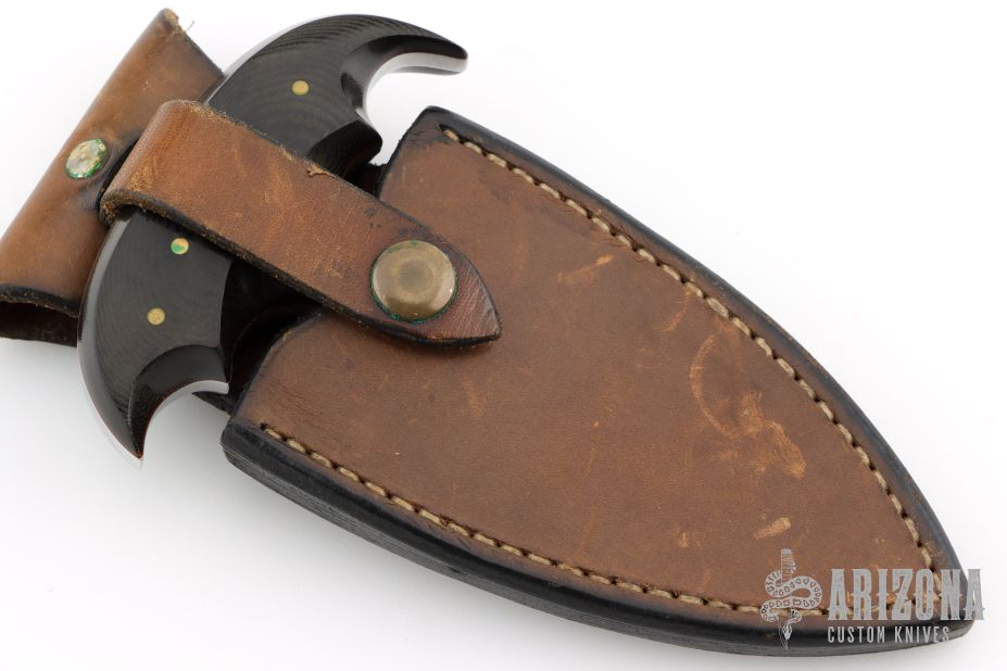 This Push Dagger by Jon Schulps features a satin finished double-edged blade with .244" blade stock and 2.125" blade depth, full tang construction. The handle has pinned micarta covers. Comes with a leather belt sheath. Has some light scratches, great condition otherwise.