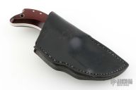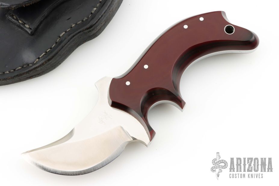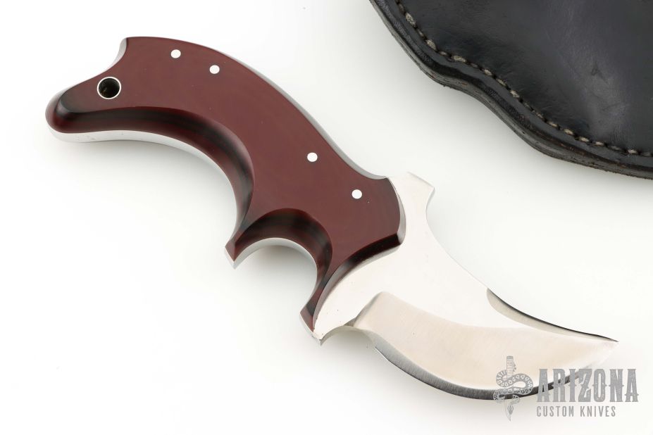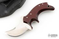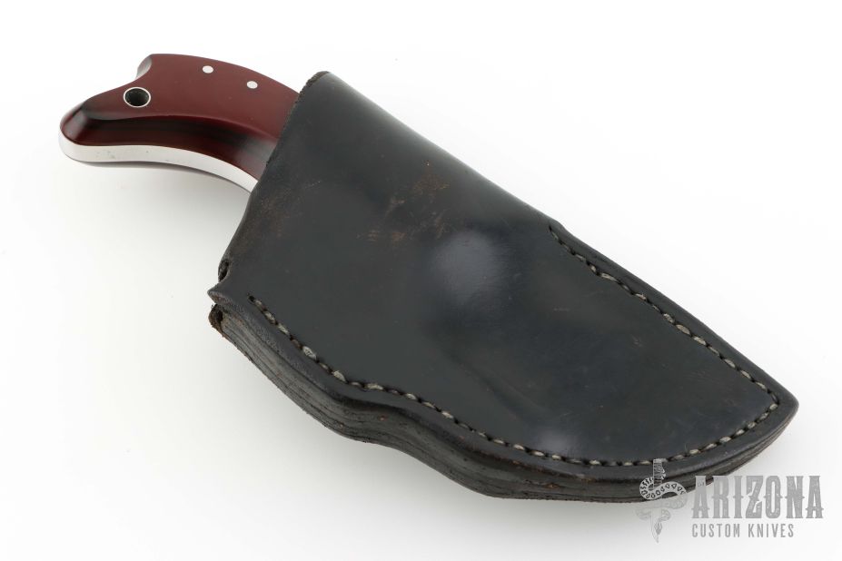 This knife by Jon Schulps features a satin finished blade with mirror polished flats, .243" blade stock and 1.541" blade depth, full tang construction. The handle has red/black paper micarta scales with brass pins. Comes with a black leather sheath. Has some light scratches, otherwise excellent condition.