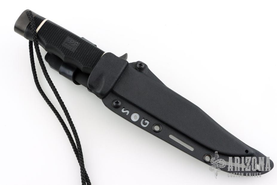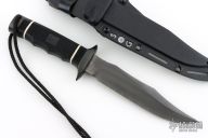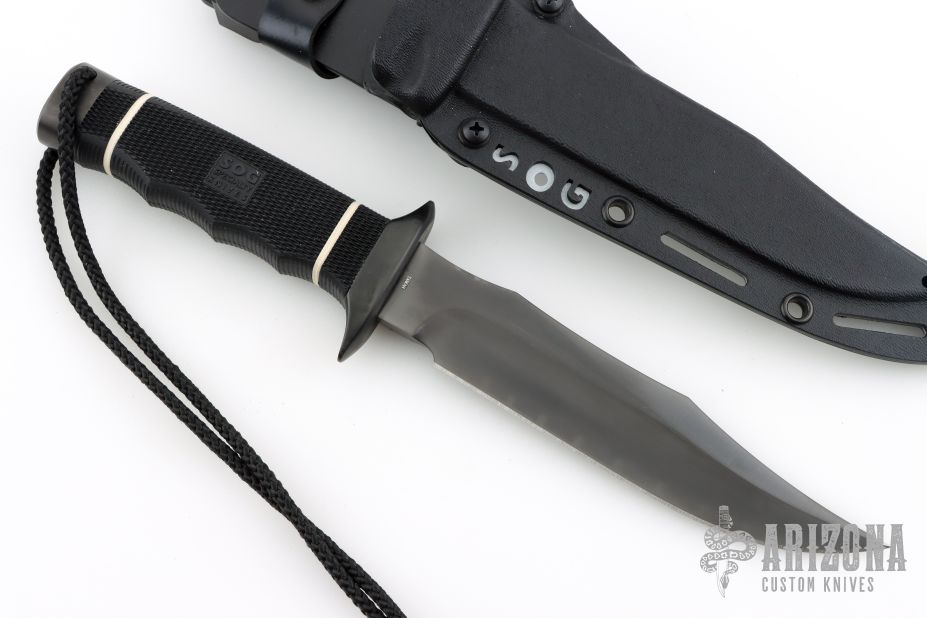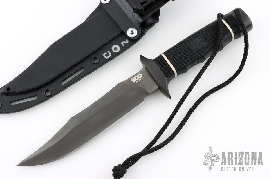 This Tech Bowie from SOG Knives has a black TINI coated clip point blade with false top edge, .229" blade stock and 1.235" blade depth, hidden tang construction. The handle has a black TINI coated steel guard and pommel with Kraton handle. Excellent condition. Includes original box and kydex sheath with belt loop.
