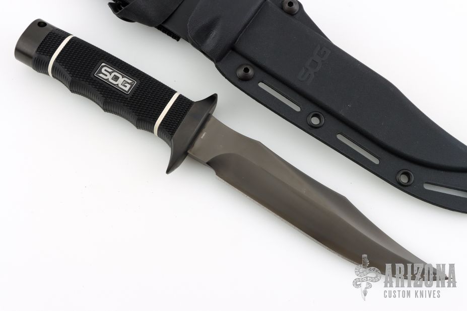 This Tech Bowie from SOG Knives has a black TINI coated clip point blade with false top edge, .229" blade stock and 1.235" blade depth, hidden tang construction. The handle has a black TINI coated steel guard and pommel with Kraton handle. Excellent condition. Includes original box and kydex sheath with belt loop.