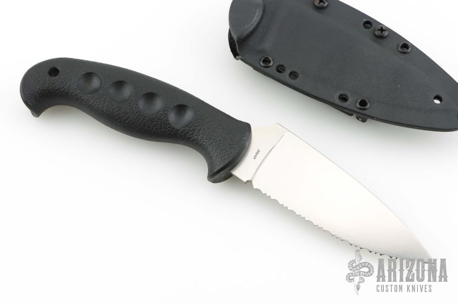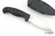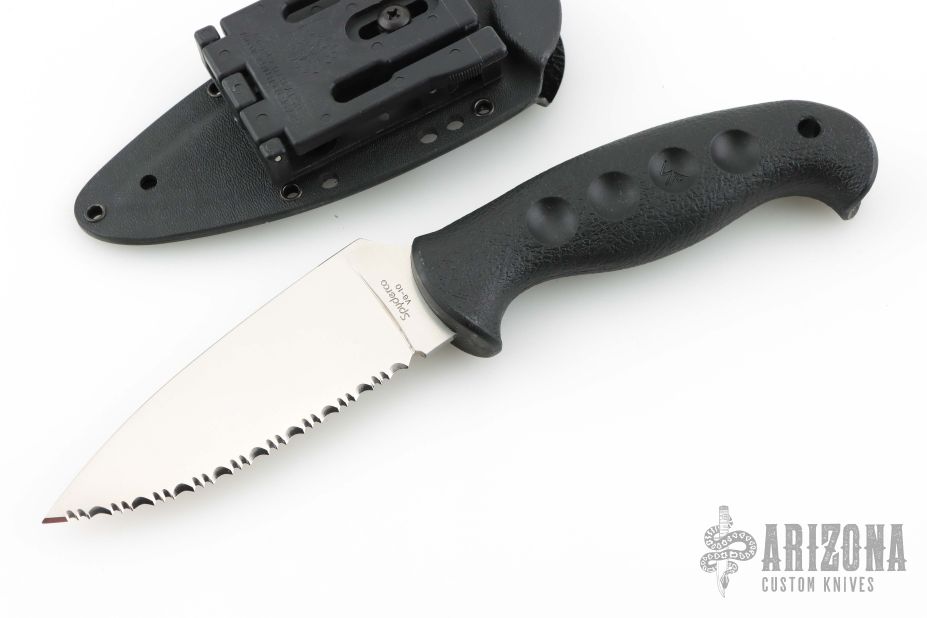 This Temperance fixed blade by Spyderco features a satin finished drop point blade with notched thumbrest, .156" blade stock and 1.456" blade depth, hidden tang construction. The handle is black plastic. Comes with box, papers, and kydex sheath. There are a couple light scratches on the blade, excellent condition otherwise.