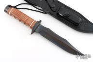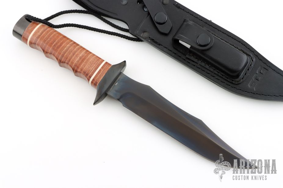 This Super SOG Bowie features a black bowie blade with false top edge, .261" blade stock and 1.504" blade depth, hidden tang construction. The handle is stacked leather with white spacers, and black steel double guard and butt cap with lanyard hole. Comes with black leather sheath with honing stone and original box. Excellent condition.