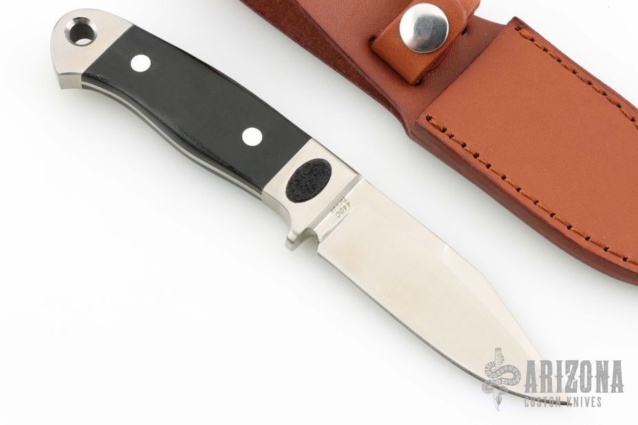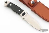 This Integral Hunter by AG Russell features a satin finished blade with false top edge, .146" blade stock and 1.099" blade depth, full integral tapered tang construction. The handle has micarta scales and stainless steel pins. Comes with original box, and brown leather sheath. Has non-slip inlays at the guard/bolster. Excellent condition.